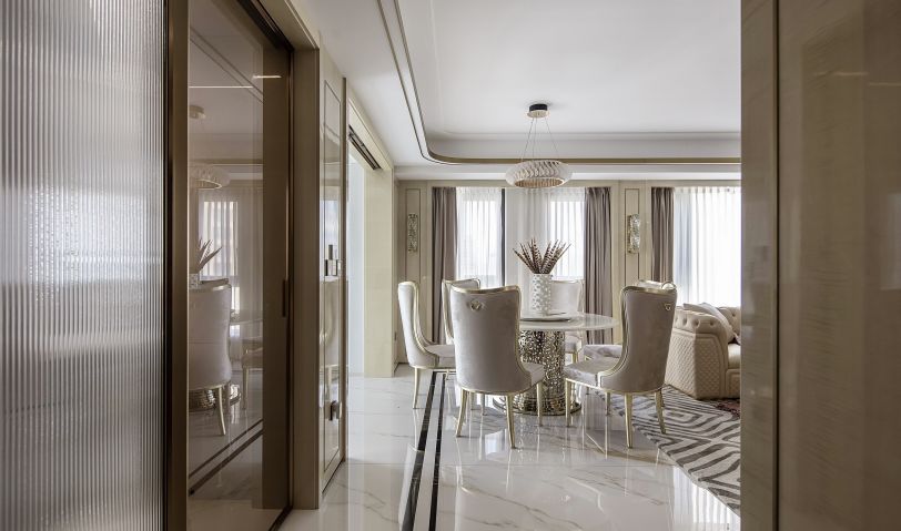餐廳和客廳互通的設(shè)計,打造了一個自由開放的空間,讓視野更加開闊,餐廳軟裝的選用 也很好的體現(xiàn)了低調(diào)中帶一絲奢華的理念