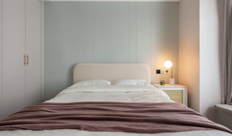臥室是感受睡眠藝術(shù)的空間 因此在色調(diào)的運用上避免過于艷麗的顏色,而使用予人冷靜安謐視覺感受的色澤,原木色的地板、山林畫的床頭背景、礦石灰色的墻板,以及整體同色系的軟裝搭配,呈現(xiàn)了一個細(xì)膩、自然、舒適、寧靜的空間。