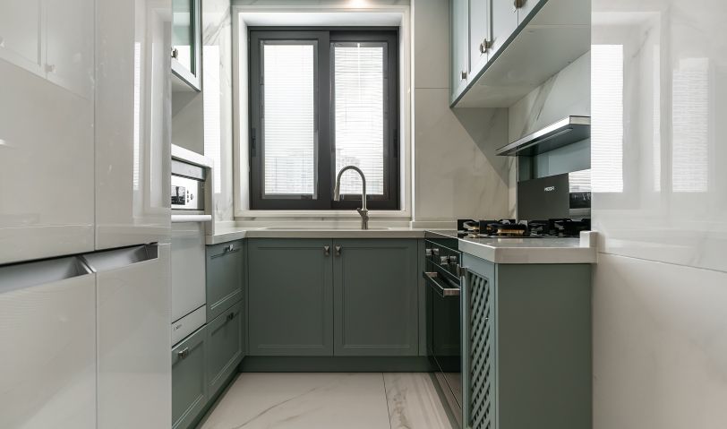 廚房采用長虹玻璃的推拉門,可以讓屋內(nèi)有更好采光的同時也可以起到一定的弱化遮擋效果,主業(yè)偏愛小美式莫蘭卡色調(diào)櫥柜,與白色瓷磚的碰撞,無疑顯露著業(yè)主有顆少女心。