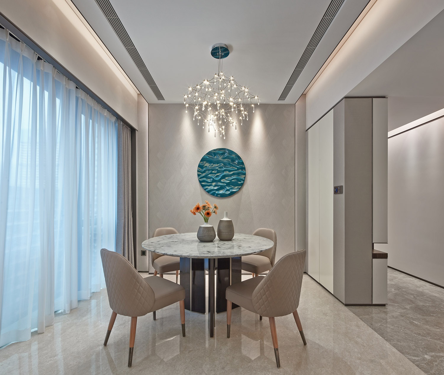 這世間,唯有美食與愛不可辜負??筒蛷d天花采用多層次的燈光,主燈采用BAXTER 的吊燈,搭配輕奢質感的墻布,這樣就是一個舒適愉悅的就餐空間了。人與人之間只要有一個焦點,就能讓我們匯集在一起,去探討美好的人生。質感的島臺和藍色的靠背,就好像海面的小島一樣,在這里喝酒暢聊,有一種自由暢然之感。