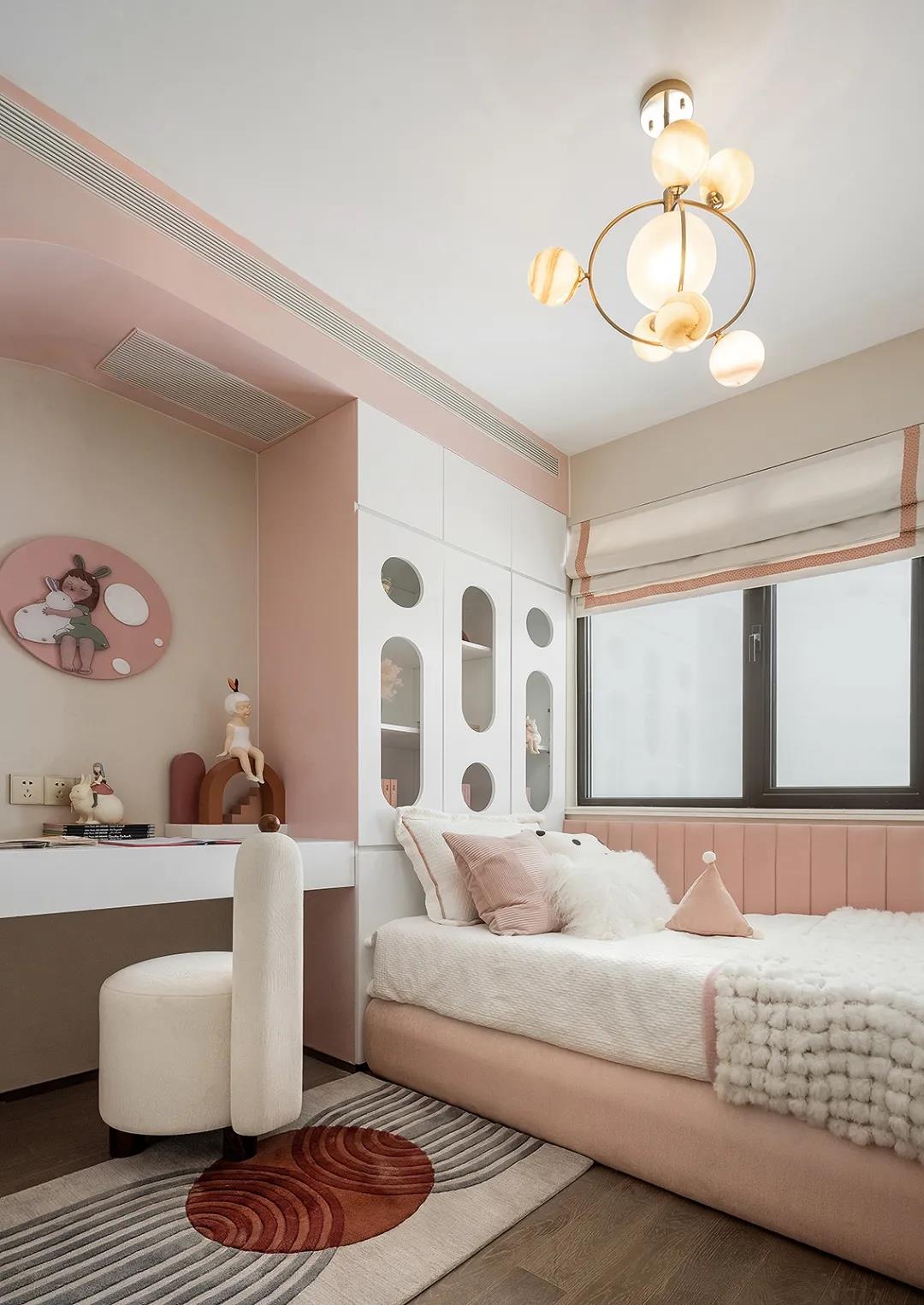 設(shè)計(jì)師賦予此間的是女孩溫柔可愛的性格,圓形幾何語素的地毯和燈具、生動(dòng)活潑的擺件與掛畫,在淺粉與白色的色調(diào)烘托下,氤氳出女孩的浪漫與純真。