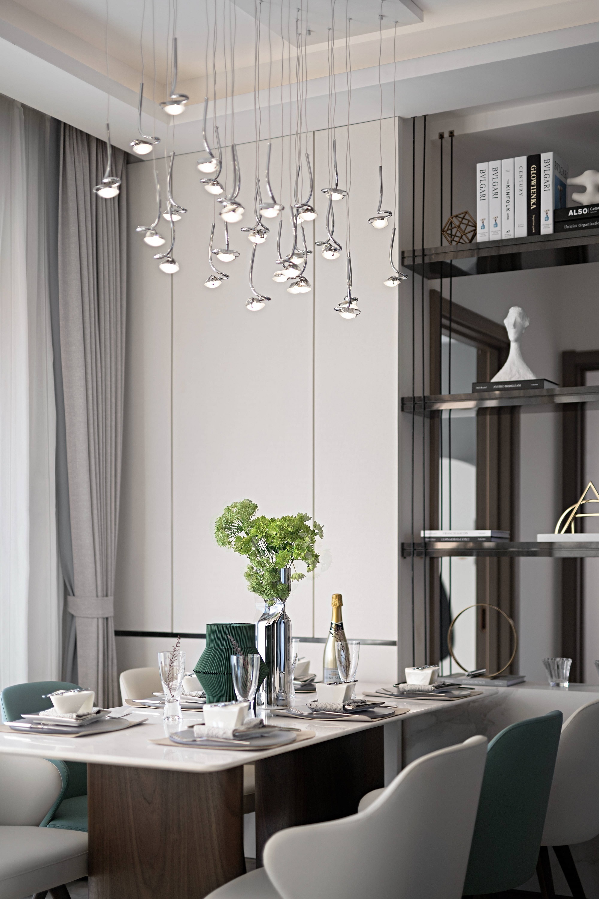 餐廳設(shè)計中當(dāng)白色彌漫后,出現(xiàn)一抹淡綠,其效果不亞于冬雪中的一朵向陽花。簡單的配色搭配上金屬擺件,溫馨而淡雅,使其視覺感官更加舒服。