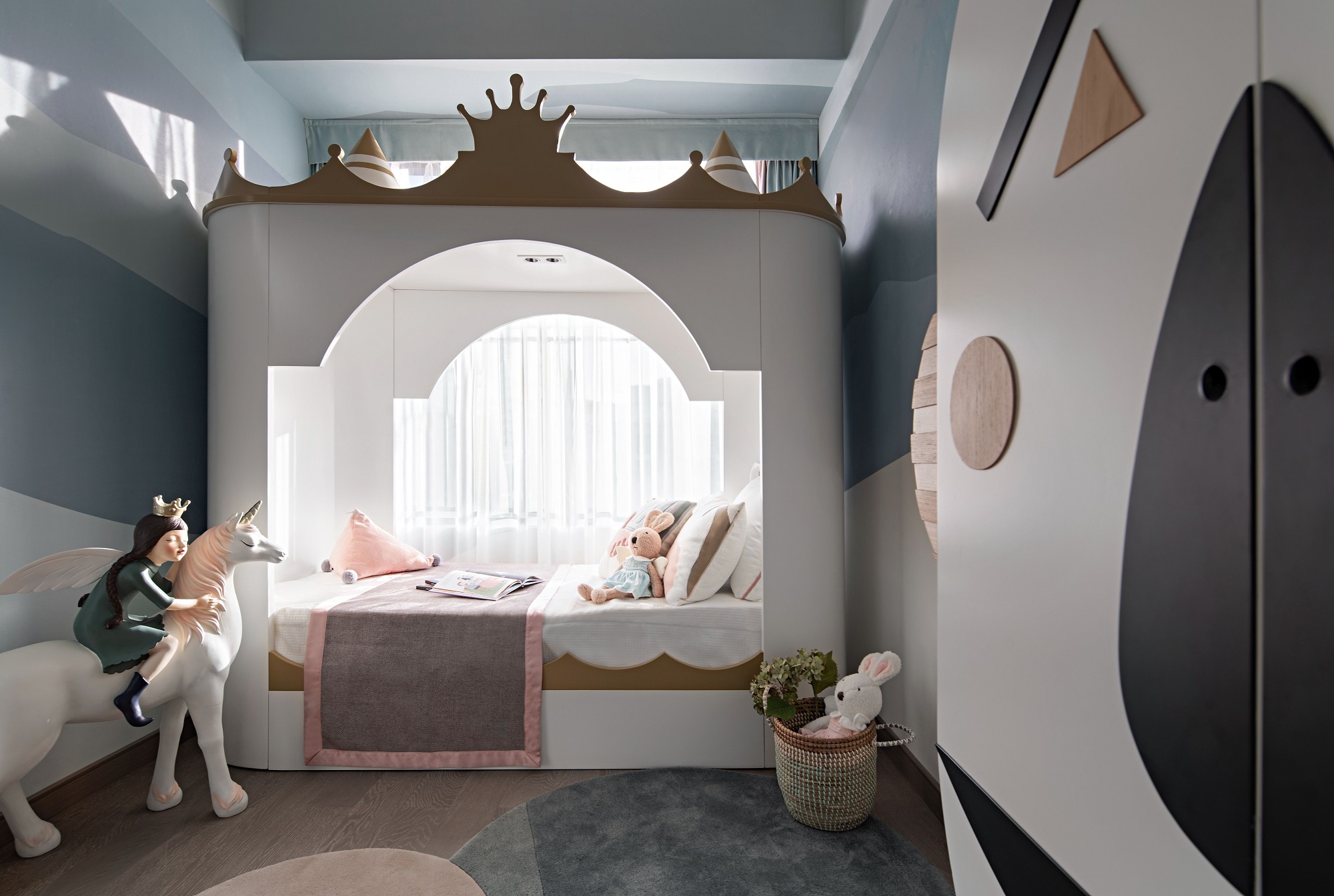 輕盈的紗窗將光線引入室內(nèi),營造輕松舒適的氛圍。小布偶,獨角獸,頗顯自由的態(tài)度,每個女孩心中都有一個公主夢,選用飾品的顏色是單純而鮮明的,整個臥室氛圍比較輕快舒適,或安靜、又溫馨,擬造這一個夢幻般公主房。