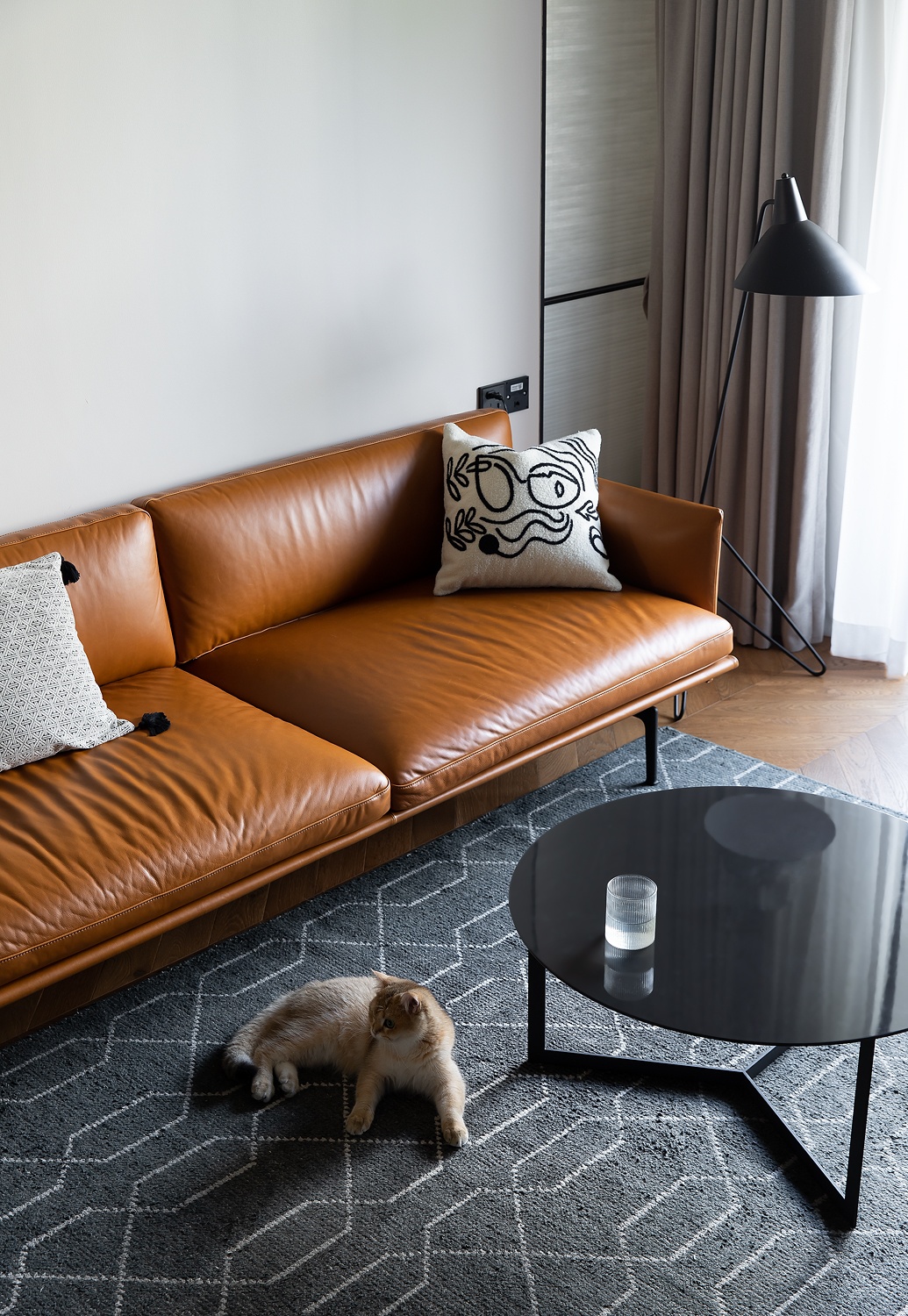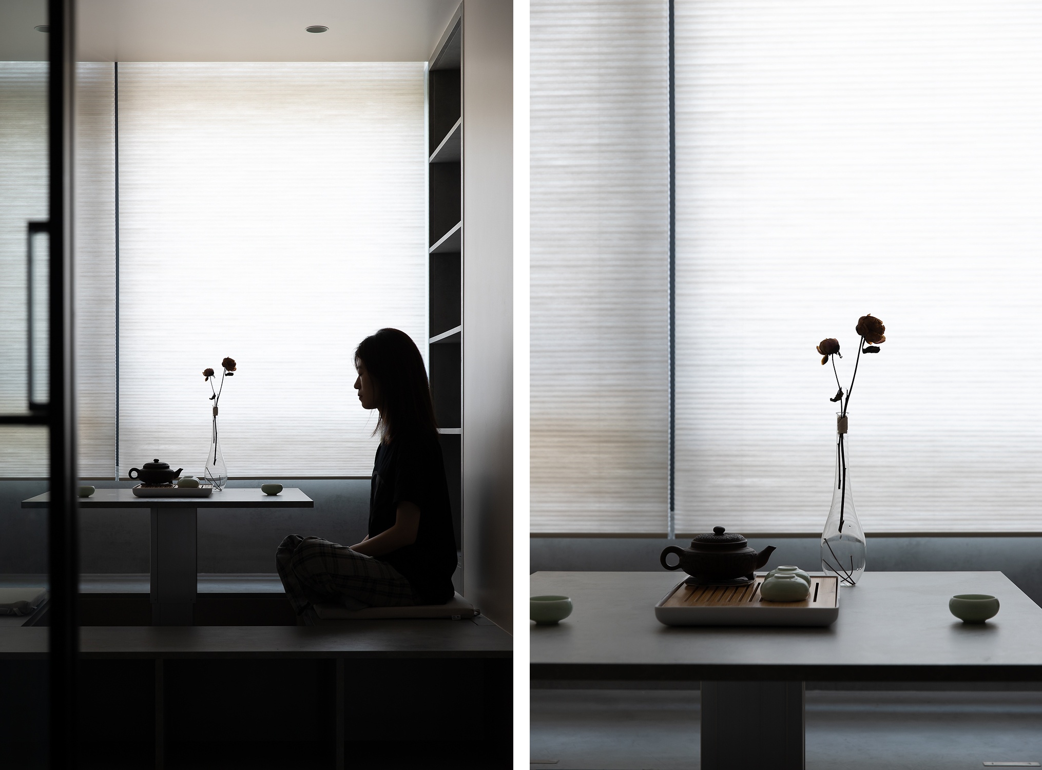 這里是通過墻體拆除保留的空間,作為日常辦公休閑的居心地,流露著一份從容自在。并且可以自由切換生活場景。品茗閱讀、居家冥想、擼貓下棋,都沉淀著一份生活的純粹。