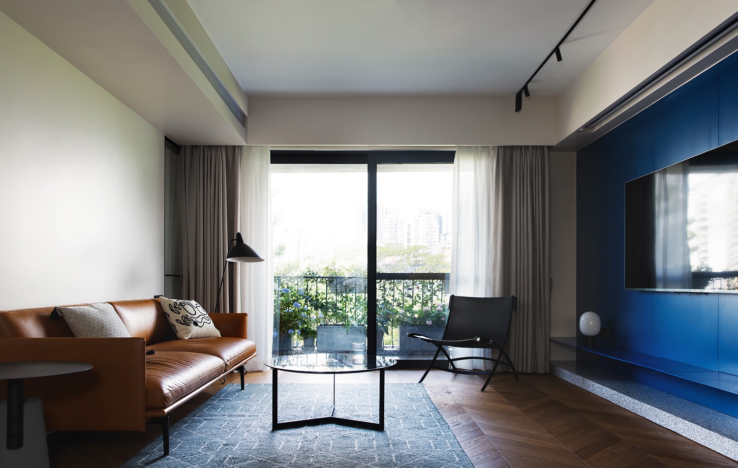 客廳通鋪人字紋木地板,溫潤的質(zhì)感與餐廳形成材質(zhì)上的空間劃分,克萊因藍與愛馬仕橙的張揚對比,一面沉靜溫婉如女主,一面熱情健談如男主。當(dāng)藝術(shù)界的純凈之藍遇上優(yōu)雅的金色,一種超脫色彩本身的視覺心理效應(yīng)產(chǎn)生,空間的氣質(zhì)讓屋主可以隨時捕捉和追尋最真實的自我,在忙而不亂的生活中,遇見自己的小世界。
