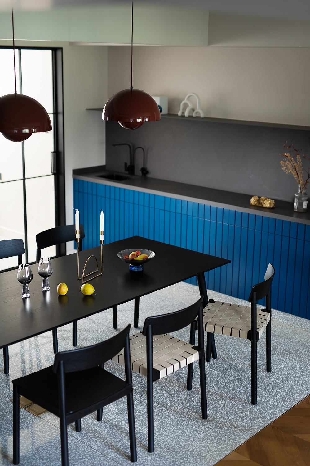 拓寬后的餐廳區(qū),處于開門即見的C位,水磨石地面與餐邊操作臺形成強烈的視覺沖擊感,酒紅色丹麥cabana的吊燈更是對整個空間點綴了一絲復(fù)古風(fēng)情