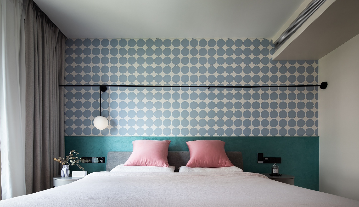 空間以飽和度較低的粉色調(diào)為基底,為室內(nèi)營造出潔凈溫暖的視覺感受。恰到好處的床頭壁燈,把美夢藏進溫柔的時光里。