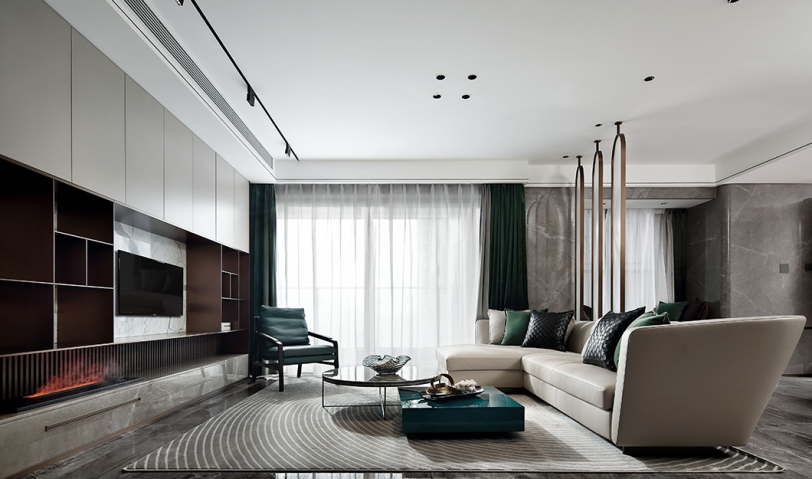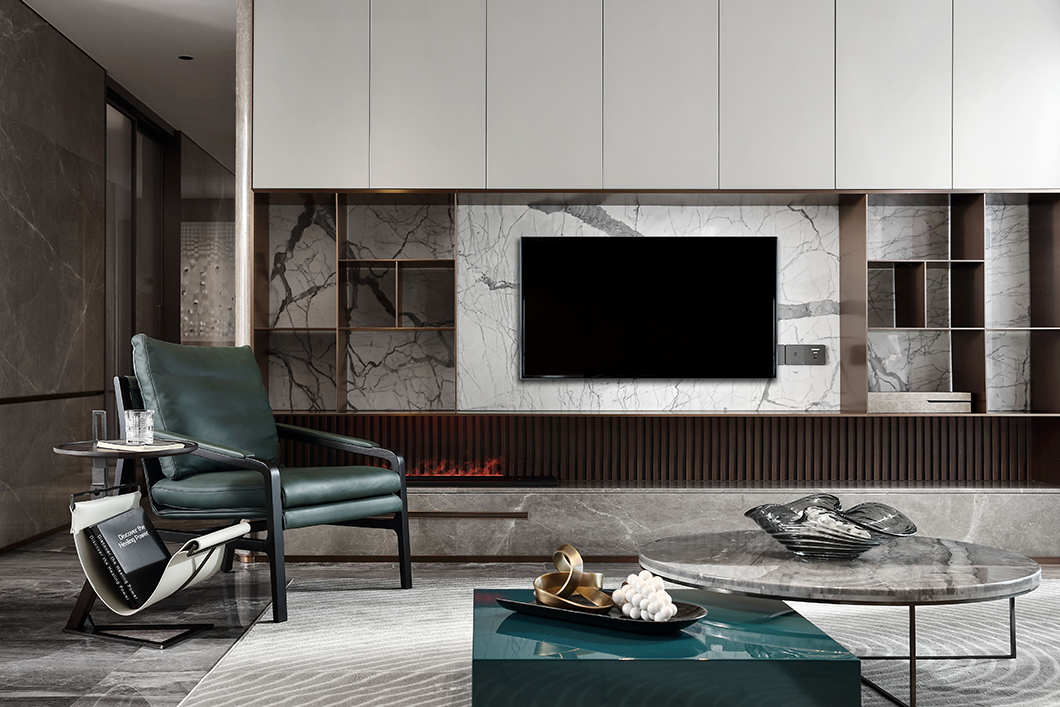 客廳茶幾與單椅創(chuàng)新地運(yùn)用了帶有底紋的墨綠色,沉靜內(nèi)斂又不失新意。同時(shí),沙發(fā)與茶幾均保持了較低的水平面,不僅令空間顯得大氣,也讓主人的生活狀態(tài)更趨舒適和休閑,或坐或臥或躺,都散發(fā)著寧?kù)o的自由感。