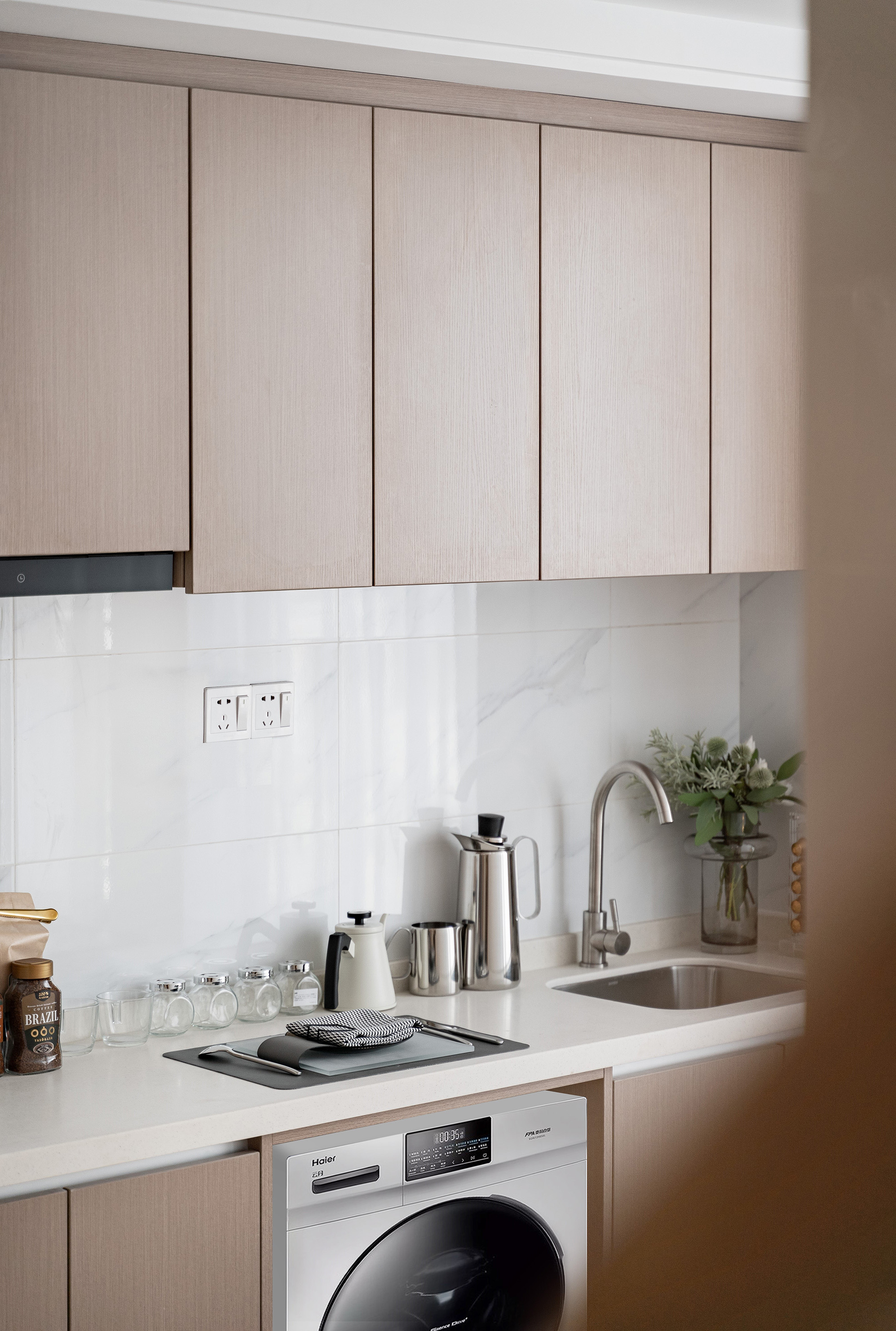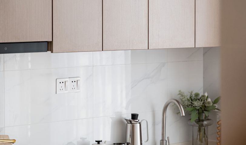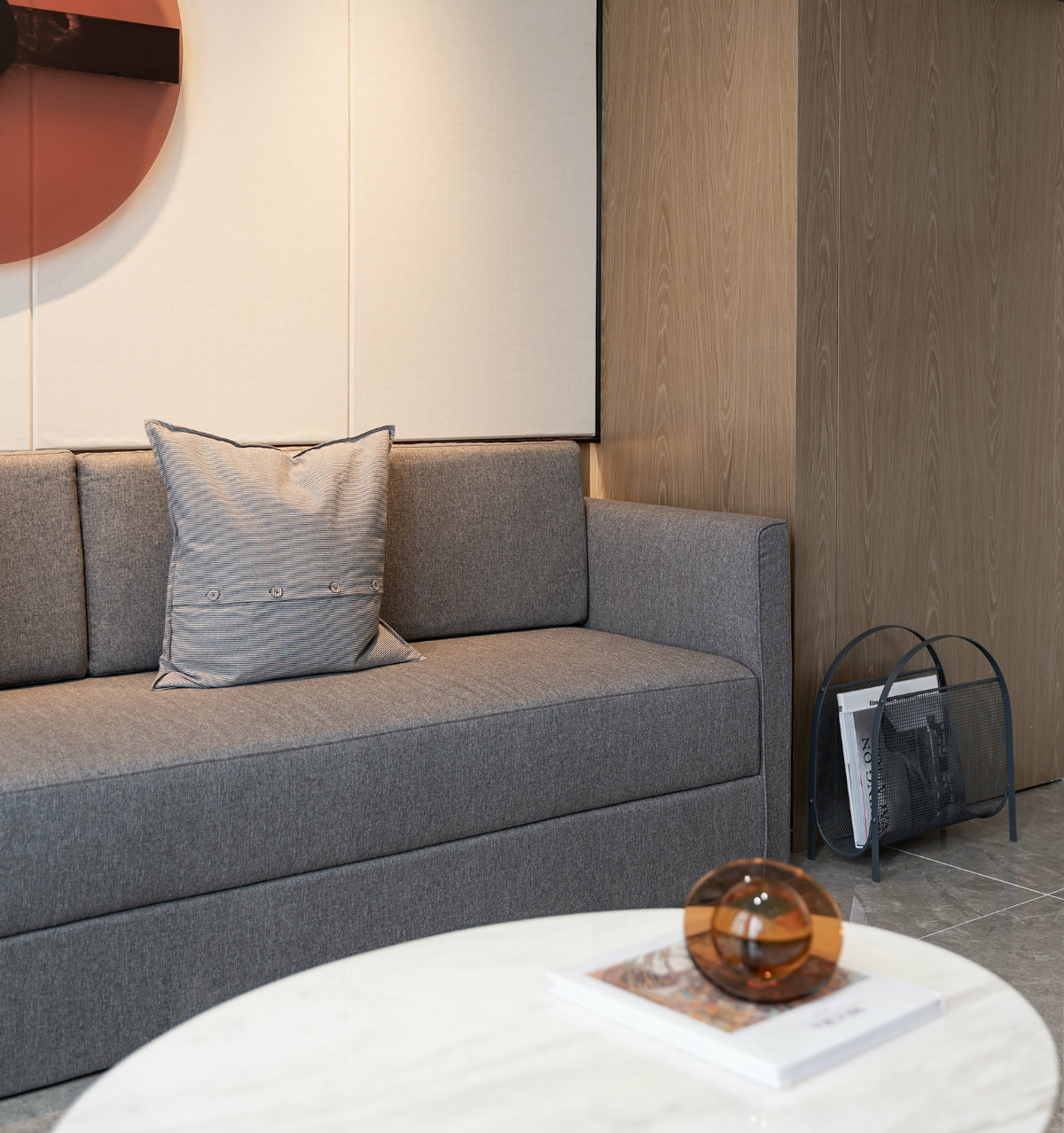 客廳沒(méi)有繁雜的裝飾,使用純白色的背景墻,木皮的溫潤(rùn)與空間互相呼應(yīng),通過(guò)平面整潔的方式與整體木搭配,令空間層次清晰,并使視覺(jué)感受更加寬敞。