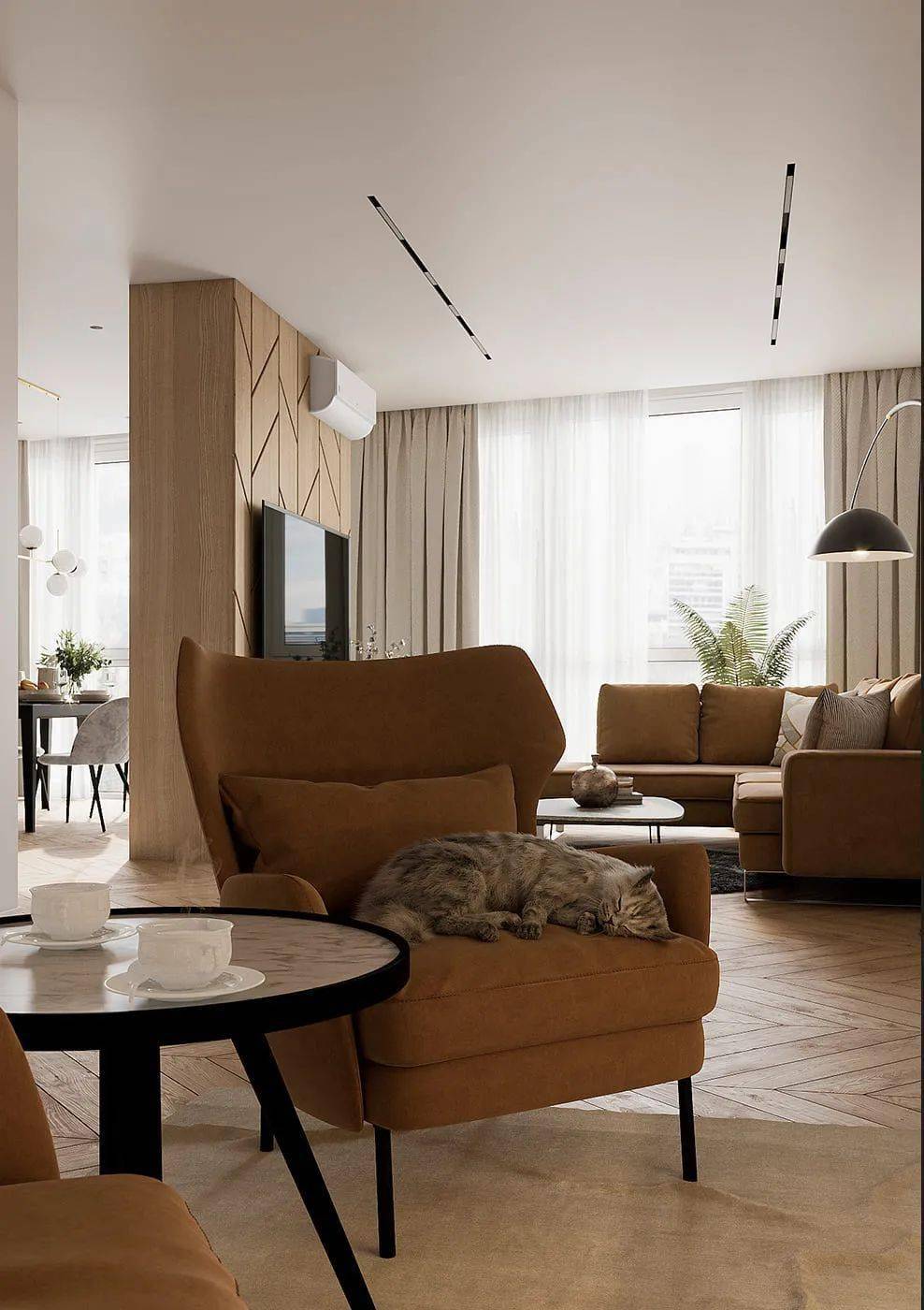 極簡(jiǎn)原木風(fēng)客廳,魚骨拼接地板與原木電視背景墻相互交織,將清爽與舒適揉合,嵌入黃色的沙發(fā),構(gòu)筑起一方閑適而自然的溫情空間。