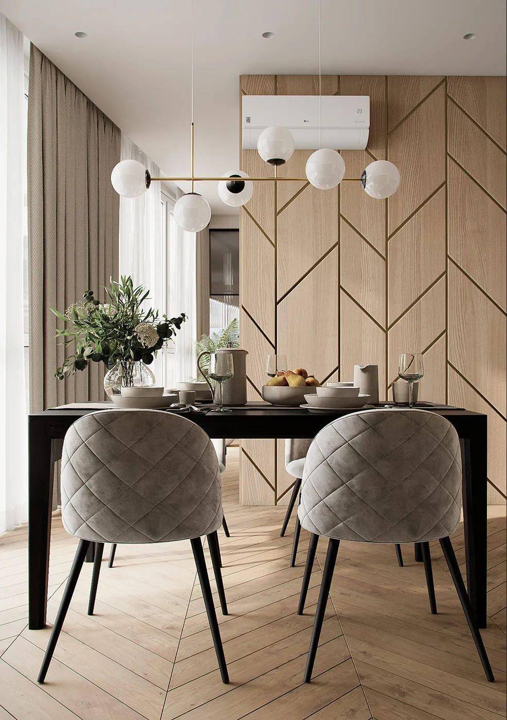 木、柵格,由墻、餐桌再到地板層層遞進(jìn),堆疊出清雅的餐廚系統(tǒng),輔以自然的色調(diào)與自然光的渲染,交匯出溫馨的用餐氛圍。