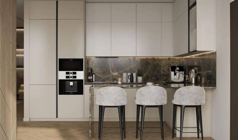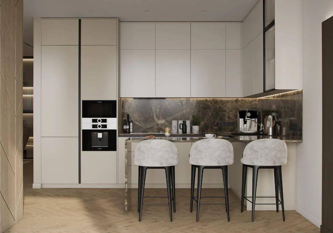 在白色膚感飾面的視覺引導(dǎo)下,延展出輕簡(jiǎn)的櫥柜系統(tǒng),無把手的立面與內(nèi)嵌家電設(shè)計(jì),讓空間變得更加舒朗、簡(jiǎn)雅,巖板臺(tái)面延伸出用餐吧臺(tái),展現(xiàn)出自在又舒適的生活之美。