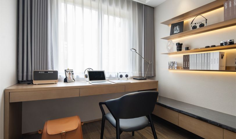 黑色皮椅所點(diǎn)綴的穩(wěn)重感,與銀色臺(tái)燈所特有的摩登感,形成微妙的氛圍組合,在嚴(yán)謹(jǐn)與靜穆中,思索人生真諦。