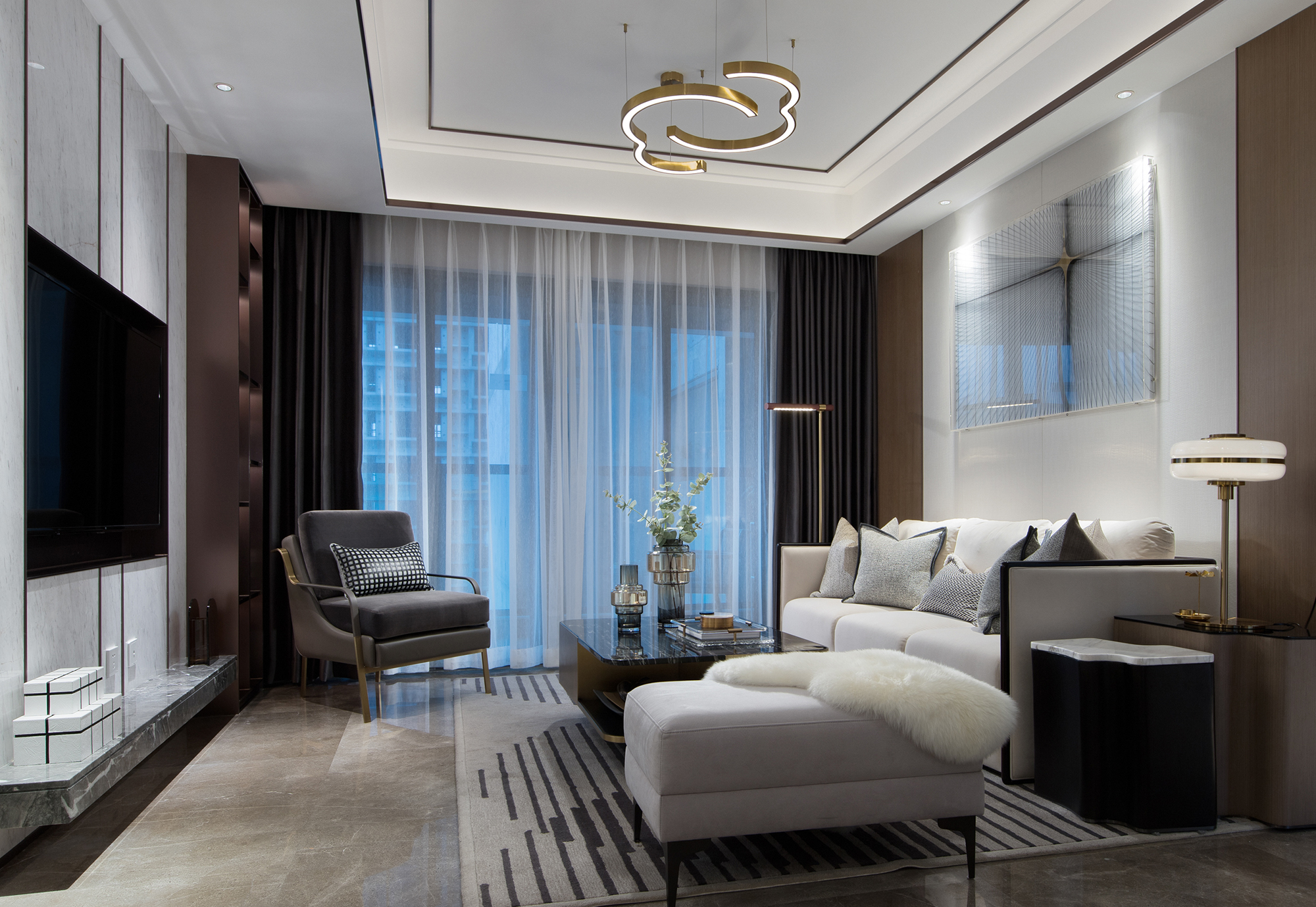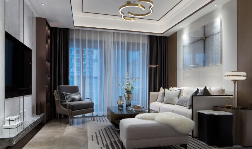 客廳以干凈利落的灰白色調(diào),鋪敘沉穩(wěn)安寧的氣息,布藝、金屬、大理石、皮質(zhì)等多種元素的碰撞,又為空間增添一份精致獨特的美感。電視機采用內(nèi)嵌式布局的設(shè)計,最大程度上節(jié)約了空間,而其一側(cè)的收納柜體,亦可適配不同的實際使用需求。