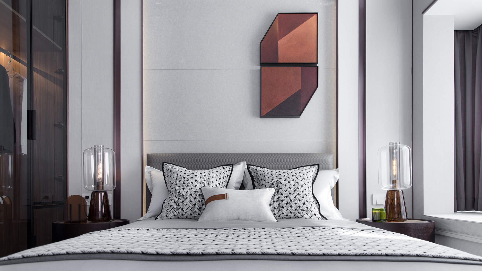 主臥空間摒棄繁雜的設(shè)計,運用淡雅的色調(diào),融合玻璃與布藝元素,調(diào)和出寧靜溫雅的居住氛圍。而一旁的飄窗設(shè)計充分考量空間體驗感,為居者提供了一個安靜雅致的休憩空間。