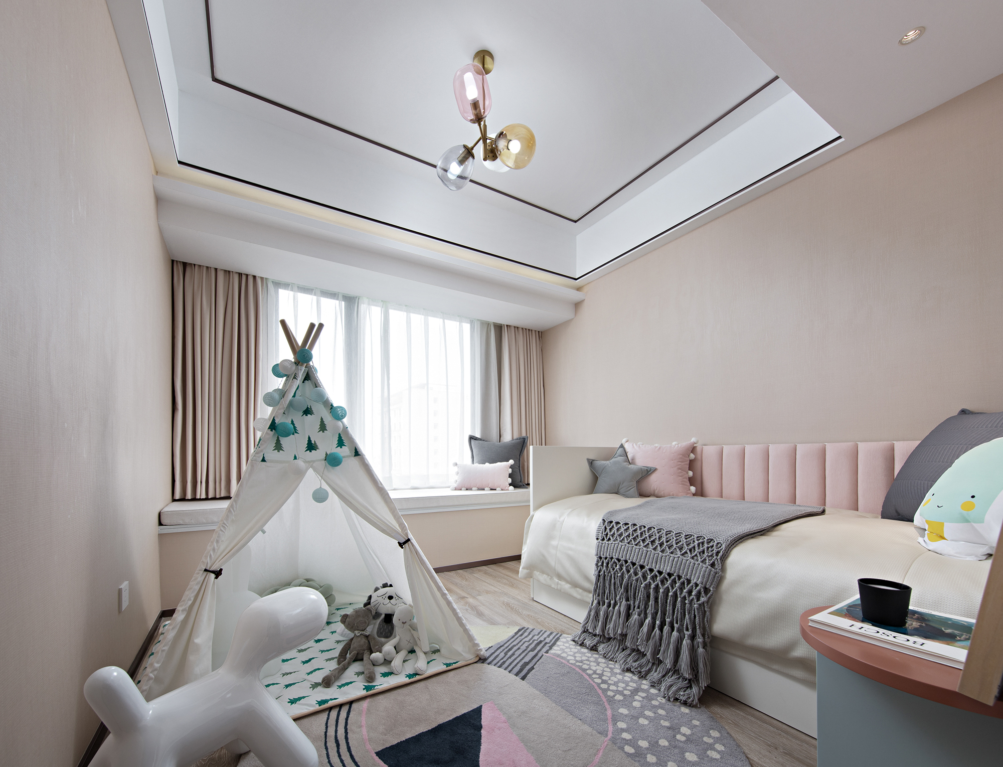 在女兒房中,可愛的動物玩偶與擺件、森林印花的小帳篷、卡通圖案的柔軟抱枕,精心有趣的設(shè)計描繪著自由而充滿趣味的童年。除此之外,出于安全性的考量,設(shè)計在床與墻體的連接處,裝貼了一排粉色軟包,令空間充溢著深層次的人文關(guān)懷。