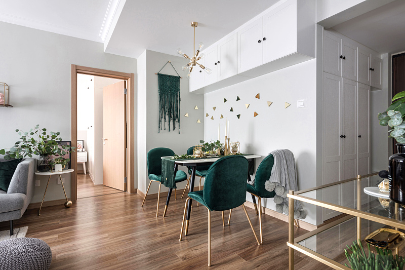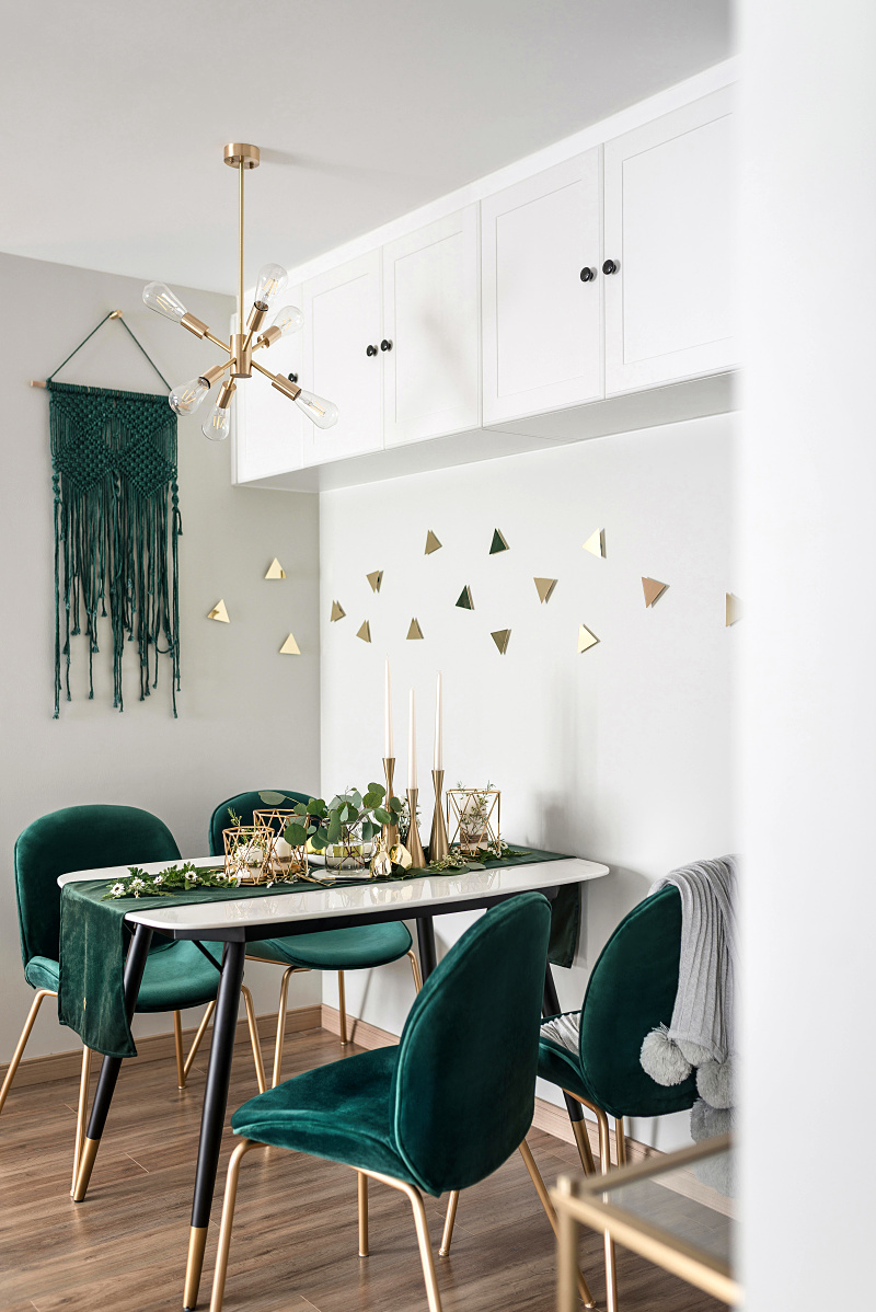 餐廳在墻面頂部設(shè)計了一個吊柜增加儲物空間,墨綠色搭配森系餐桌陳列,讓整個空間更加復(fù)古。餐廳墻面沒有選擇掛畫陳列,而是選擇民族風(fēng)的手工掛毯和金色的墻飾增加空間裝飾的更多可能性。