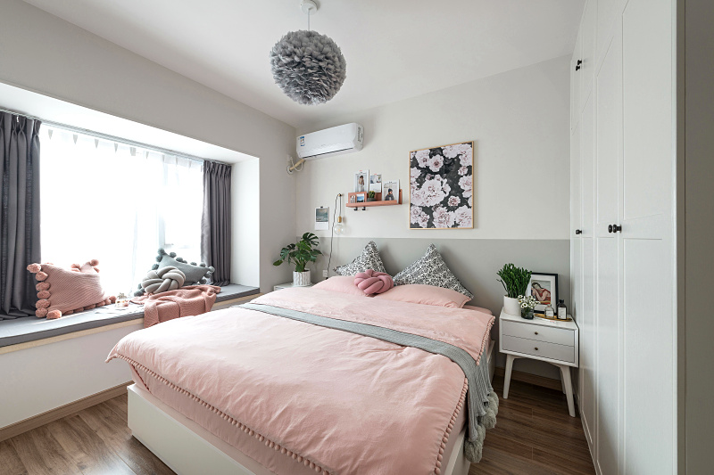 懷舊的分色墻面,隨性的壁燈,時尚的海報,自然的綠植,溫柔的粉色,無床靠的床箱,柔美的羽毛吊燈,所有的元素都在給我們訴說著這個女生的個性和心思。
