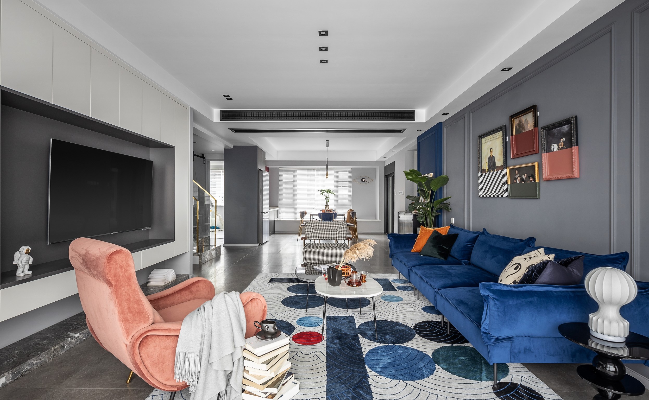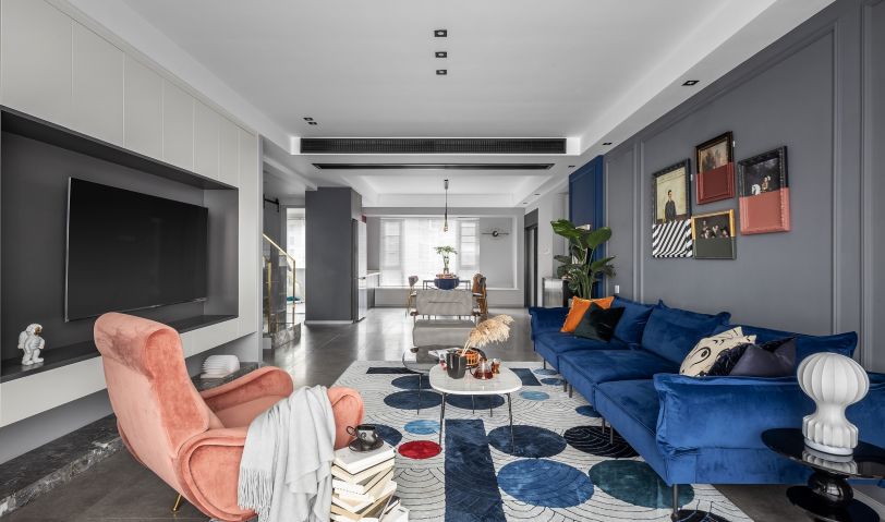 大面積的灰色面不加修飾的美,蘊(yùn)含著屋主對(duì)生活持有的美學(xué)態(tài)度。客廳主沙發(fā)的摩洛哥藍(lán)色系是客戶非常喜歡的色彩、為了色彩的延續(xù)和呼應(yīng)。沙發(fā)背造型小尺度繼續(xù)沿用了摩洛哥藍(lán)、大面積以白鯨會(huì)來做底色,更好的凸顯沙發(fā)的色質(zhì)。多元化的混搭風(fēng)格在滿足輕奢后,并沒有舍棄舒適性和安全性的追求,柔軟的布藝,曲線形狀的茶幾,地毯的圖案也在靈動(dòng)跳躍于整個(gè)空間。仿佛每一件物品都被賦予了屬于空間的歸屬感。