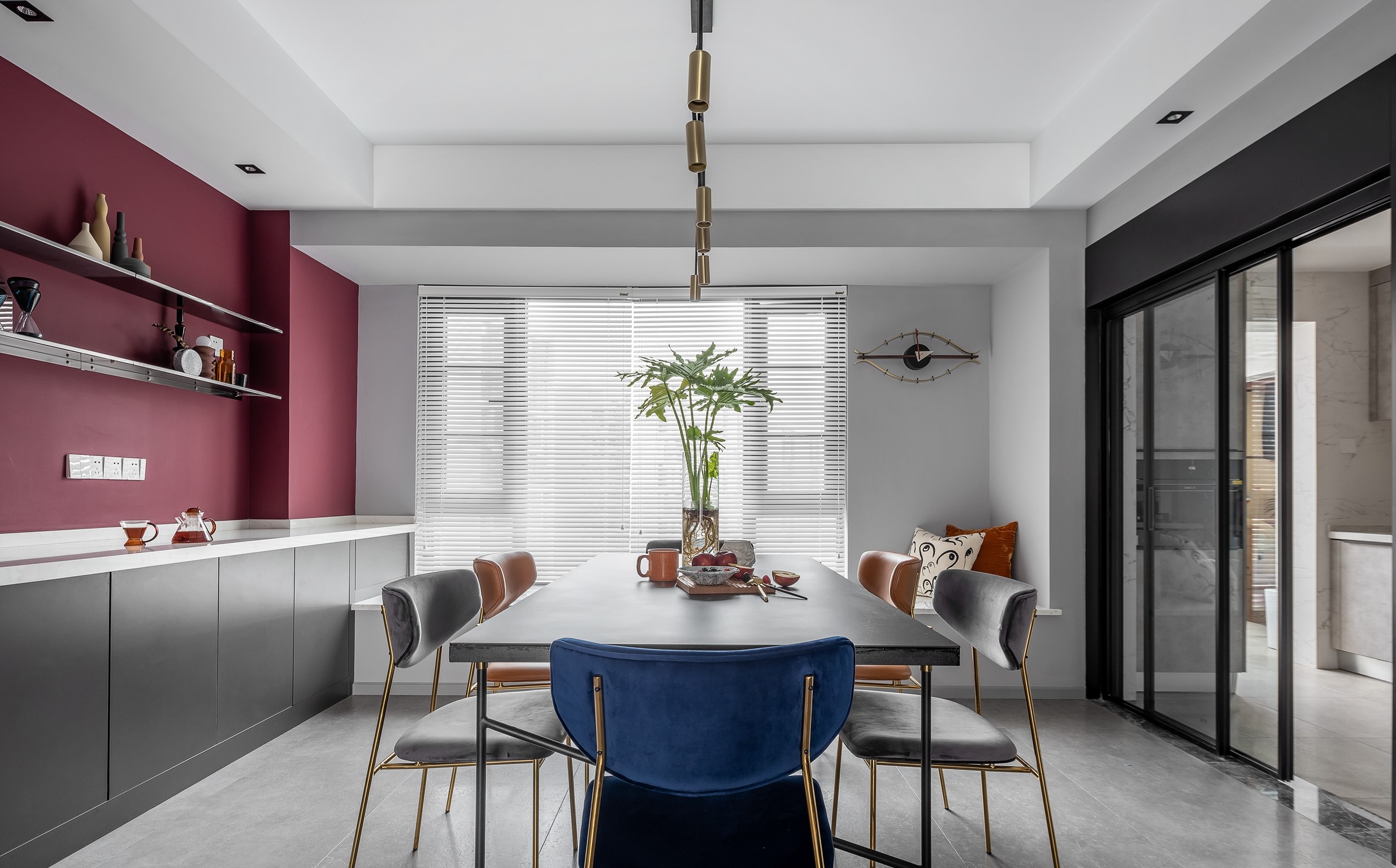 餐廳部分視野開闊、與客廳動(dòng)線緊密聯(lián)系、為了使兩個(gè)空間色彩不要過于單調(diào),西廚墻面選用了絳紅色對(duì)比。黑色墻面隔板放置著客戶喜愛的器皿、實(shí)用富有變化,增添了空間趣味感。每周屋主都會(huì)根據(jù)心情變換調(diào)整餐桌綠植。細(xì)節(jié)小設(shè)計(jì),讓簡(jiǎn)單的生活充滿儀式感。