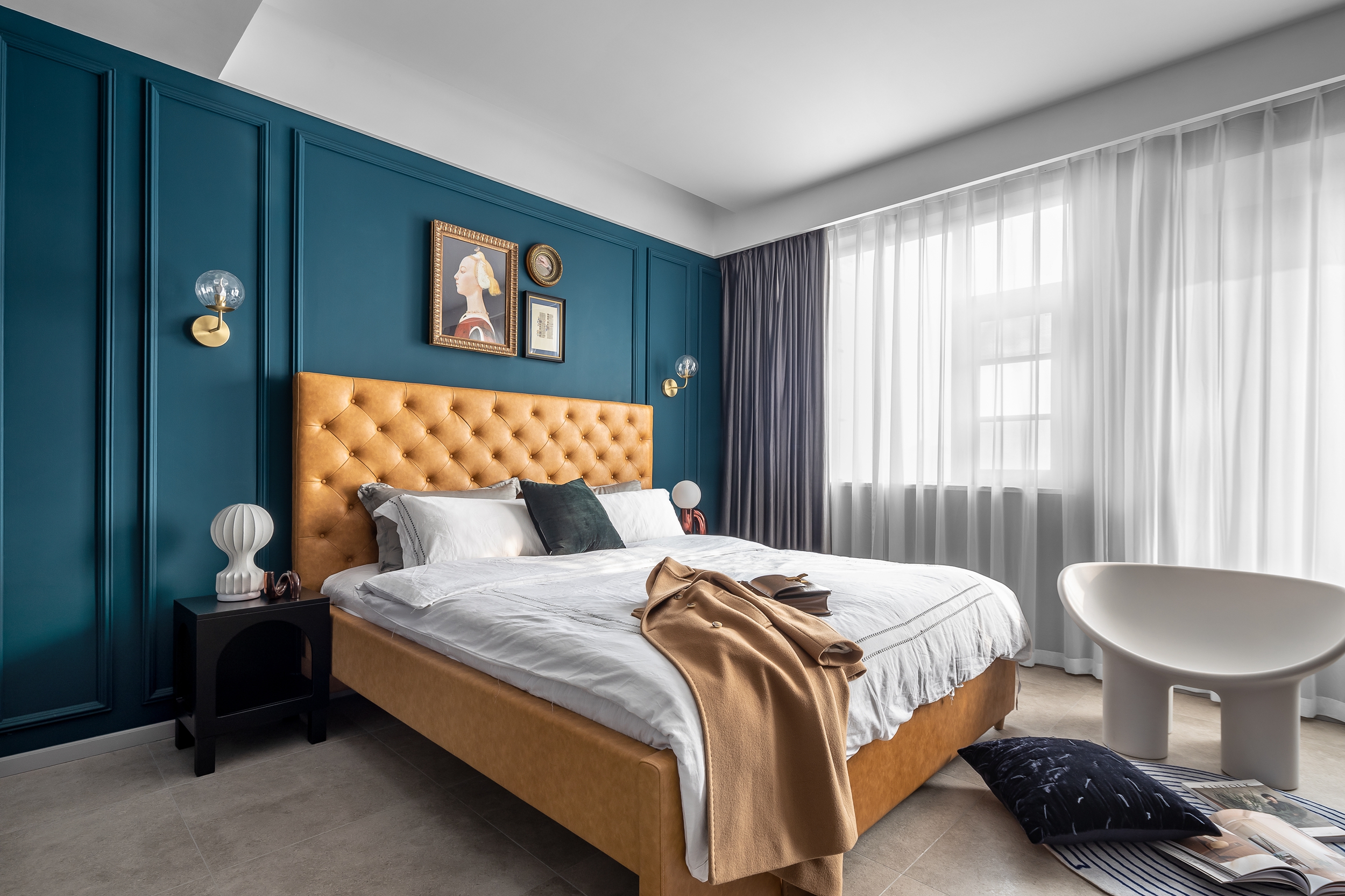 主臥室沿用客廳主調(diào)摩洛哥藍(lán)同樣加上石膏線條組合搭配太妃糖色高靠背床體、讓空間富有節(jié)奏感同時(shí)不失復(fù)古高級(jí)感。