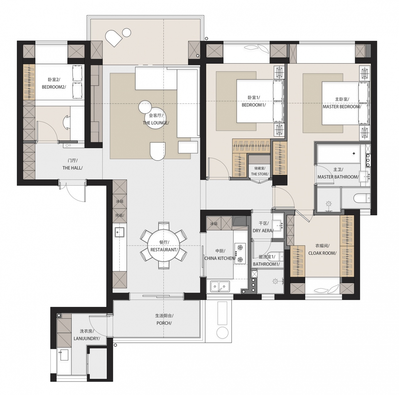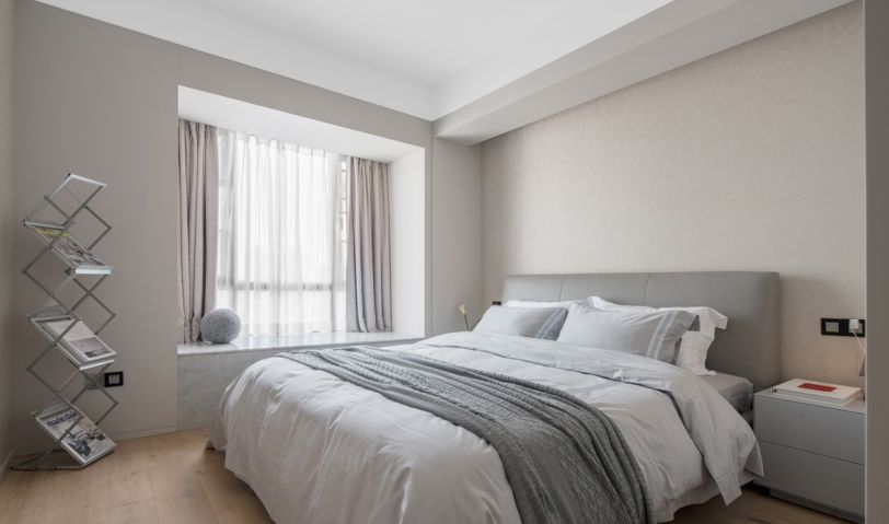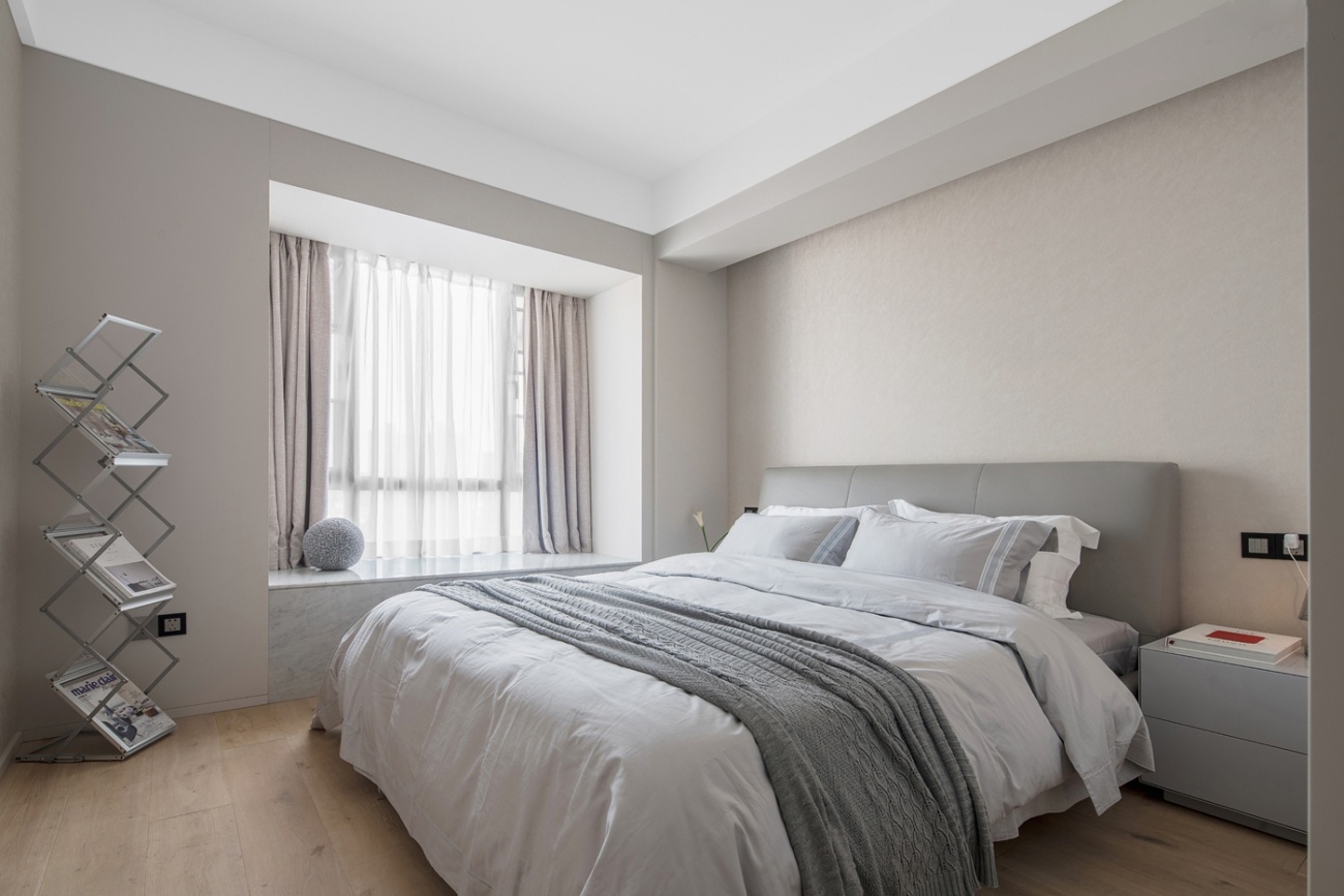 將南北兩個房間打通,形成一個主臥的套房空間,在主臥空間里,以盡量低密度的裝飾和色彩去營造靜謐舒緩的空間感受,將情感歸還于人本身,讓人成為空間情緒的主導(dǎo),留下適于思考的空間。