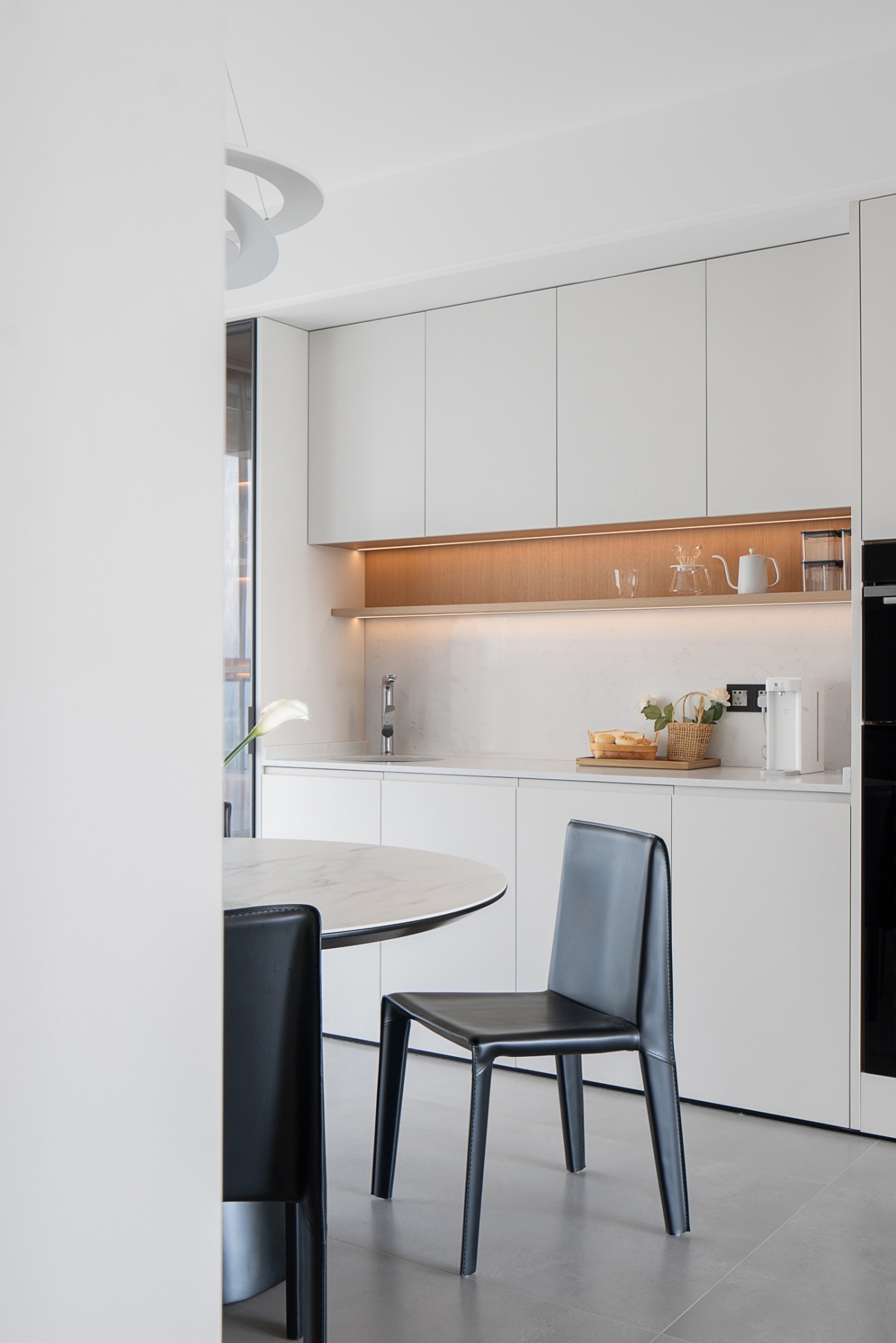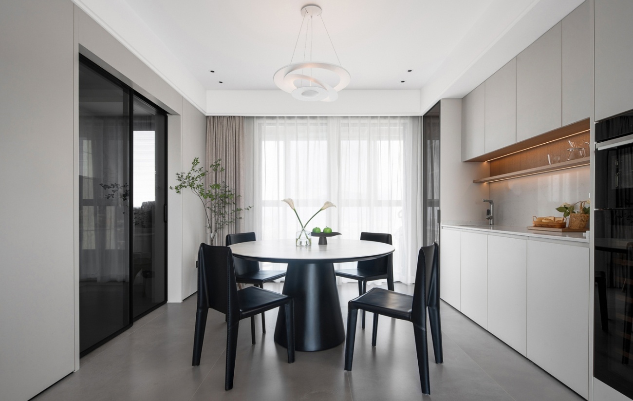 以純白來作為底色鋪陳,留下更適于發(fā)揮的色彩空間。以橡木的隔板去點亮整體的色溫,營造有溫度的餐廚空間,為就餐提供更有家庭氛圍感的體驗。