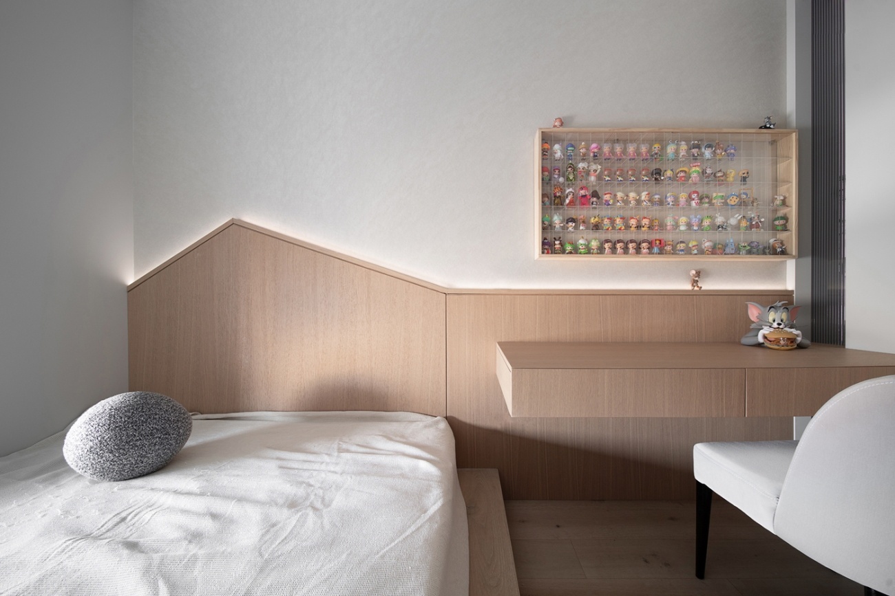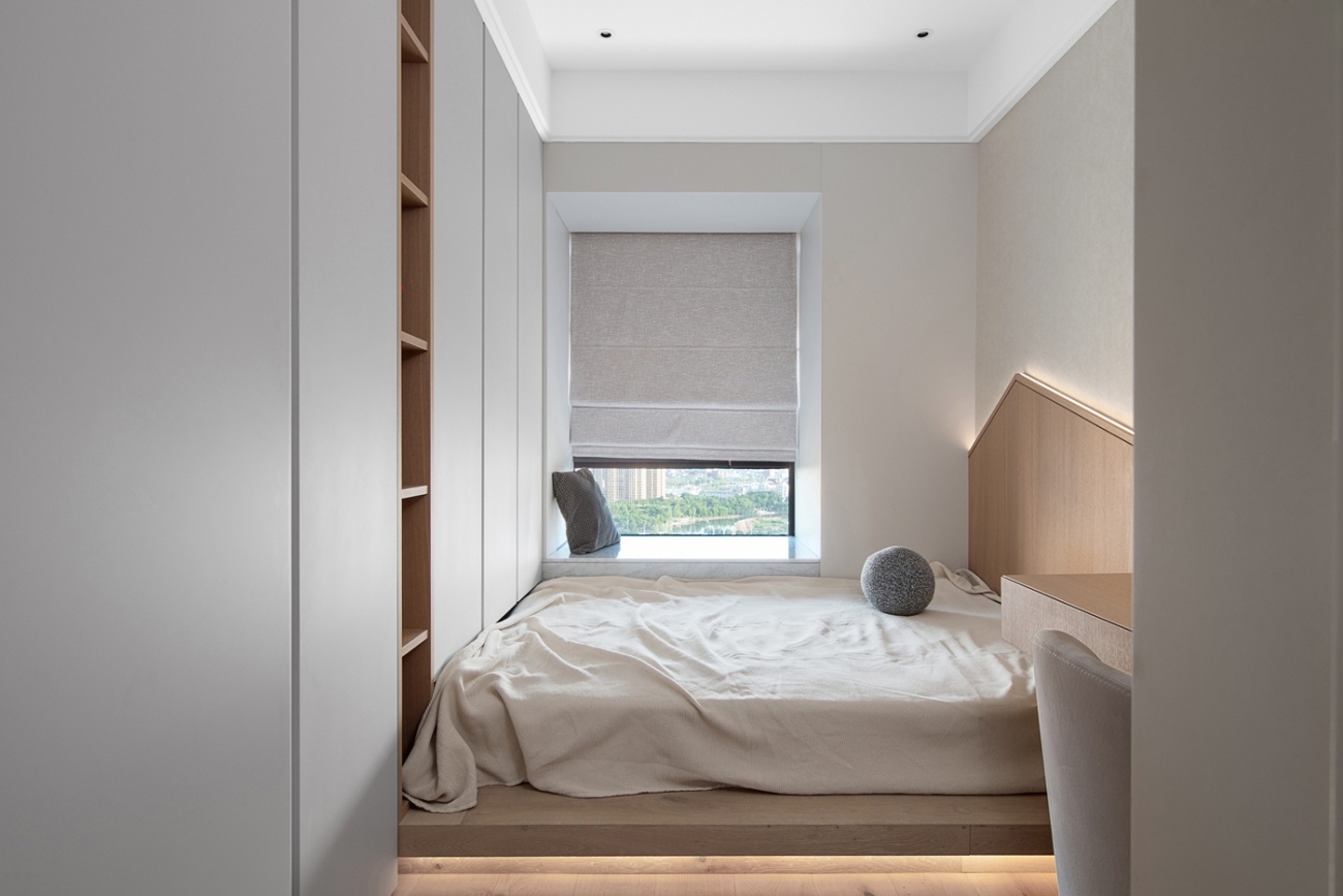 有別與傳統(tǒng)的榻榻米房,我們試圖在這個小空間里,融入更多的功能性,所以拋棄了傳統(tǒng)的做法,而是在結(jié)合了衣柜、書桌、開放式書架以后,對地面做了一個抬高15公分的處理,希望能更有利于空間的多變性,也使空間在使用的時候更加符合實際需求,達到最大化利用。