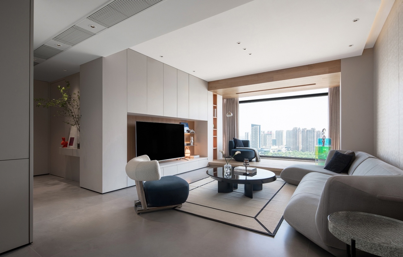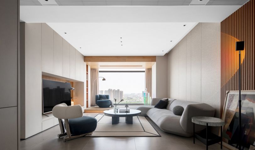 作為家庭的互動空間,我們試圖為客廳創(chuàng)造更多的使用功能。將拓展出去的陽臺做了抬高處理,提供豐富的就坐方式,獲得更多元的交流體驗。而超廣角的落地窗,提供極大的視野與明亮的光線。