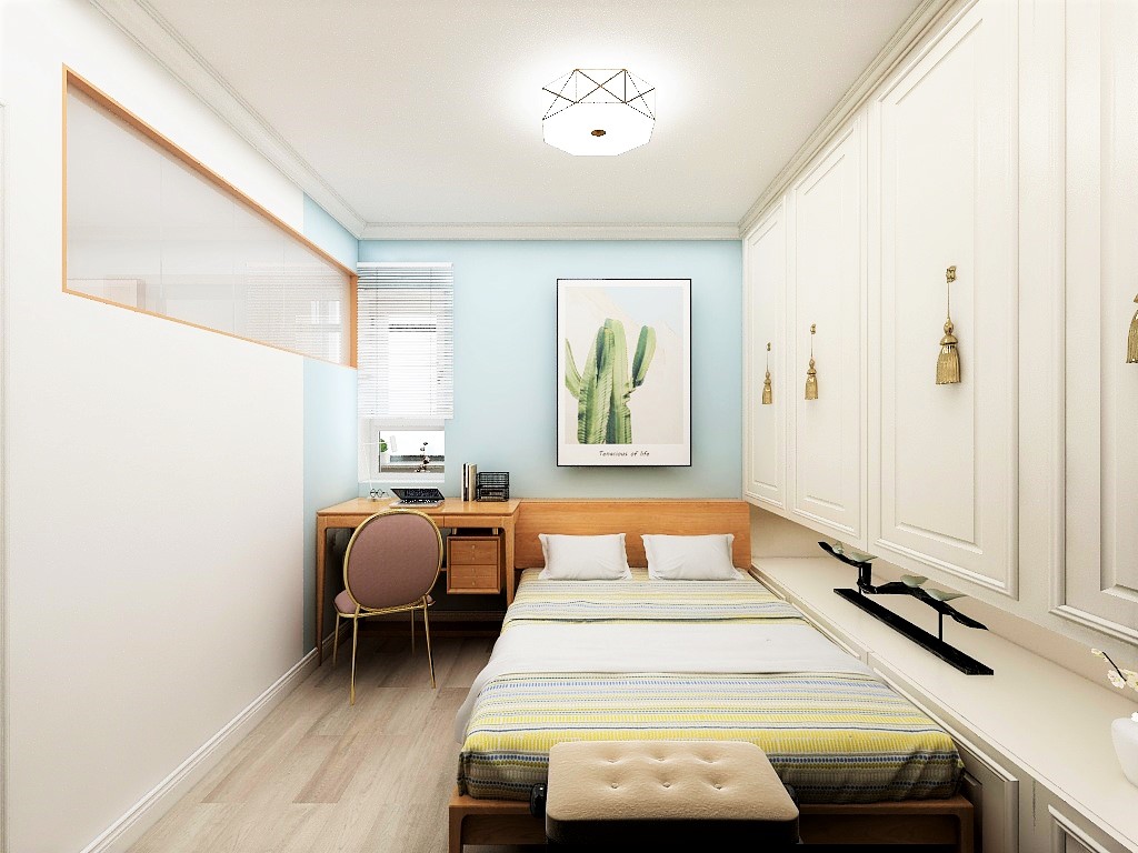 這是一個(gè)小一居室,客戶為將來(lái)孩子上學(xué)準(zhǔn)備的,需要給孩子一個(gè)獨(dú)立切有陽(yáng)光的臥室。還需要單獨(dú)的客餐廳區(qū)域。根據(jù)客戶需求合理的給他規(guī)劃了室內(nèi)空間