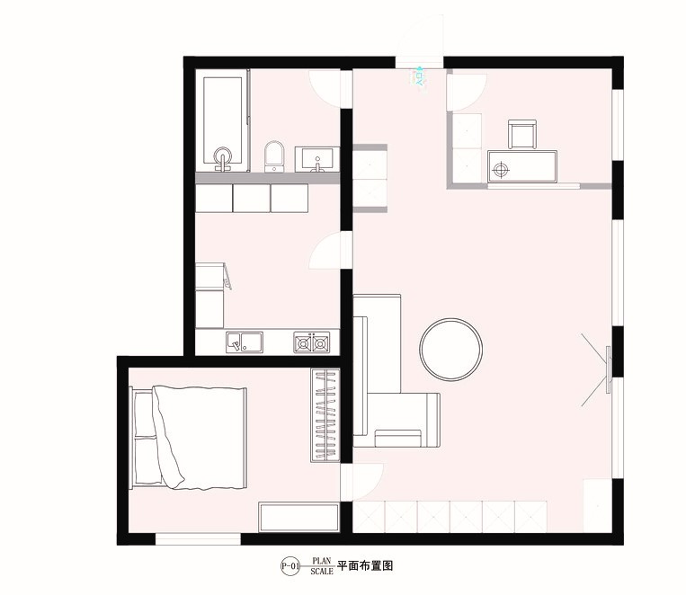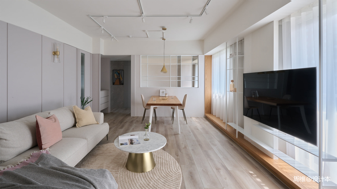 沙發(fā)背景墻隱藏廚房臥室,一體化的背景墻營造視覺的統(tǒng)一感。沙發(fā)右側收納層板和整排的抽屜滿足了收納的需求,柜子上面可以擺放裝飾品和綠植的搭配,讓功能與美感達到一個平衡。