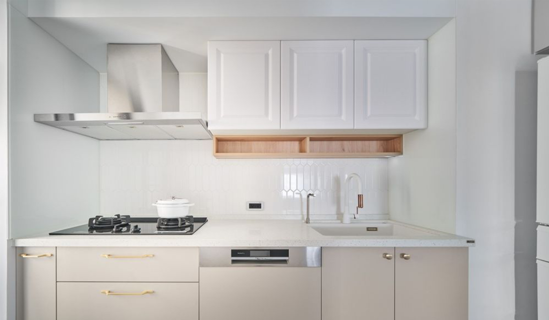 白色、香檳金的廚房配色加入黃銅色的拉手,給人干凈、舒適的視覺感受。臺下盆的設計更便于小臺面的使用。廚房雖小,日常的柴米油鹽都潛藏在這片小天地,烹飪餐食,談笑間將溫馨氛圍營造。