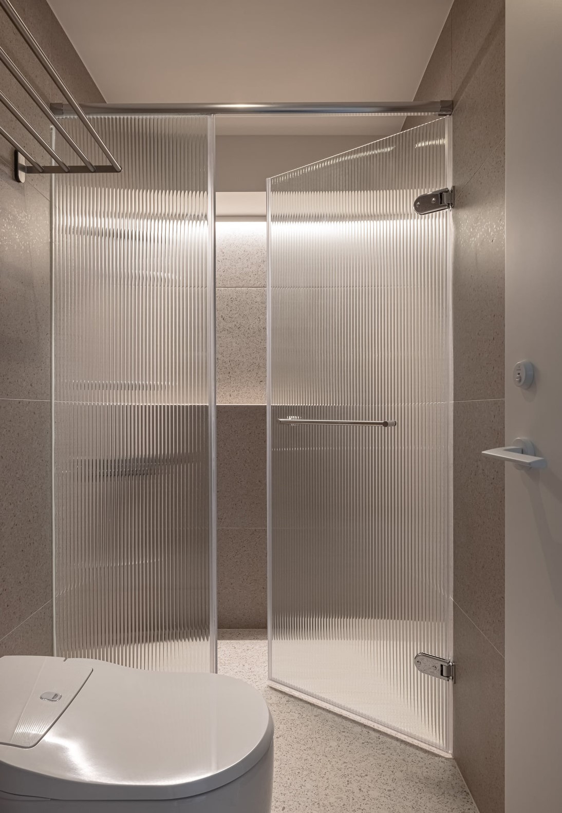 仿水磨石瓷磚給狹小的衛(wèi)生間帶來了延展,而且不易顯臟,長虹玻璃隔斷起到干濕分離的作用,同時也提升衛(wèi)生間的私密性。