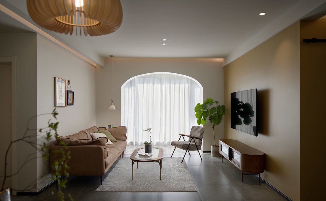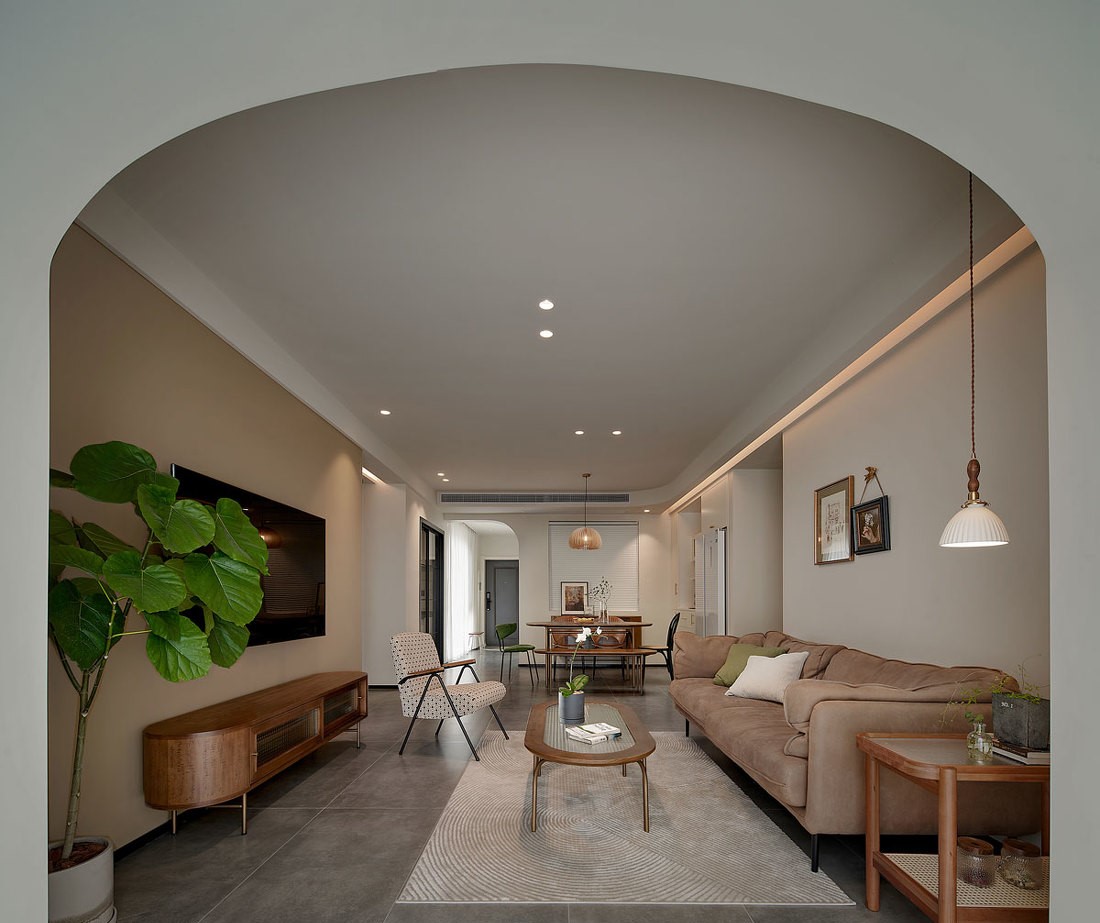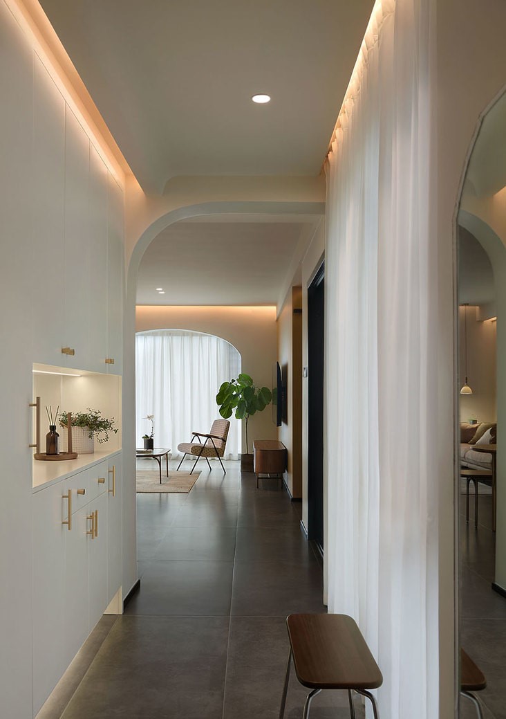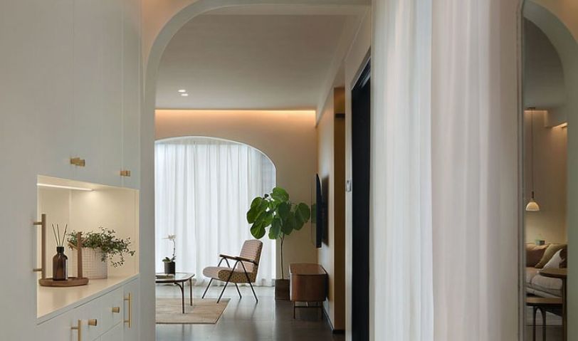 打通的陽臺與客廳合為一體,原本兩側(cè)是方形的建筑門洞改成了拱形,通過圓潤的形體吸引人的目光,成為空間的視覺聚集點。無論是大落地玻璃外呈現(xiàn)的如畫般窗景,還是拉上白紗時被微風吹拂的輕柔