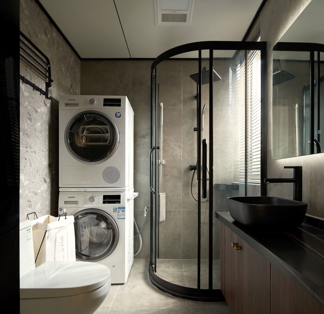 衛(wèi)生間挑選了小顆粒狀的水磨石花磚,通過地面延續(xù)到墻面的鋪貼方式,搭配灰色仿古磚。即便衛(wèi)生間也充滿了視覺美感