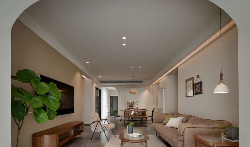 休閑陽臺拱形門洞角度看整個公共空間。電視柜、茶幾、餐桌以及餐邊柜都選用的是松木的材質(zhì),柚木色特別有做舊痕跡的復古感。搭配上低調(diào)的古銅色拉手、柜腳。在柔和奶油色調(diào)的空間里顯得格外復古沉穩(wěn)。