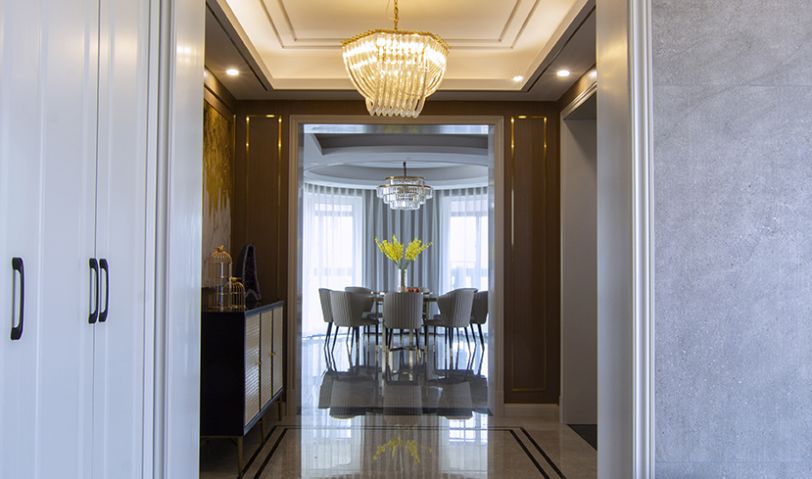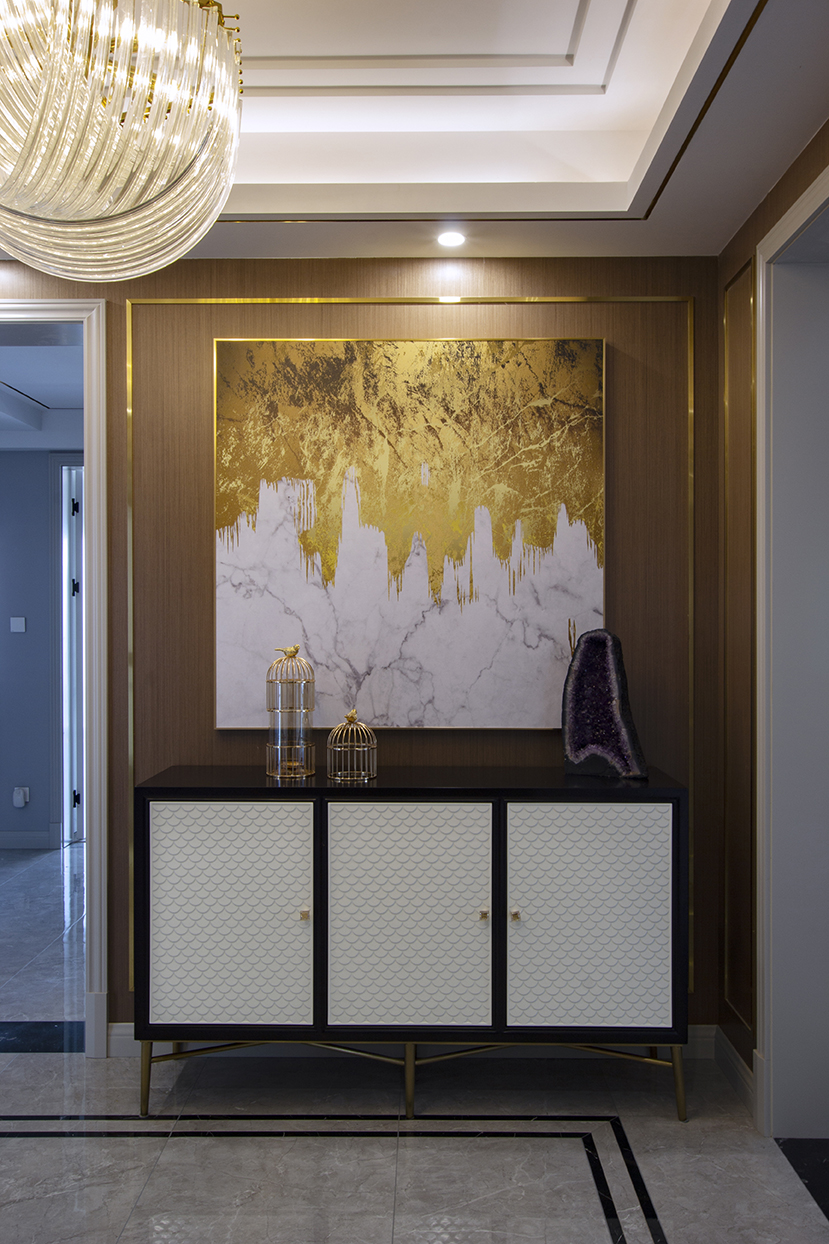 玄關(guān)處因?yàn)槭歉鱾€(gè)空間流線的中轉(zhuǎn)站,所以玄關(guān)柜設(shè)置在了一側(cè)。頂面吊頂造型和地面黑色走邊呼應(yīng),中間配了一個(gè)適中的水晶燈。