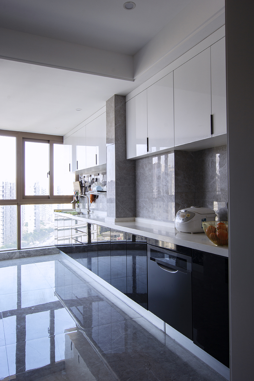廚房用了黑白色的搭配,下深上淺。大面積的落地窗,讓整個(gè)廚房更通透明亮。