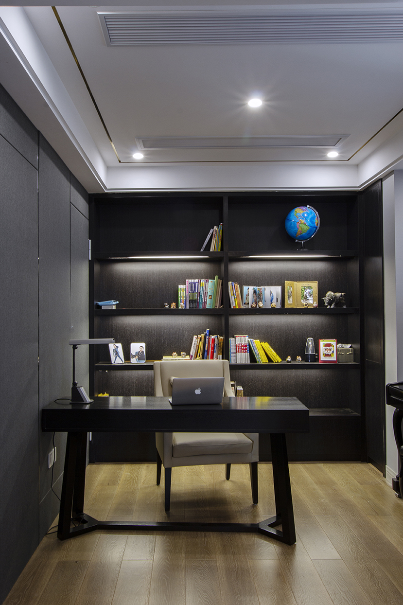 書房是一個(gè)多功能區(qū),不僅容納了書寫的功能,還在旁邊放置了鋼琴。書柜的空間是一個(gè)L形的,為了追求形式上的對(duì)稱性,讓L形的尾端做了黑色的柜門處理。燈帶隱藏在層板之中,讓這個(gè)書架不再灰暗。書架左側(cè)也是一個(gè)隱形門,面上做了硬包處理。這個(gè)是設(shè)計(jì)階段業(yè)主特意強(qiáng)調(diào)的需要預(yù)留的安全逃生門。