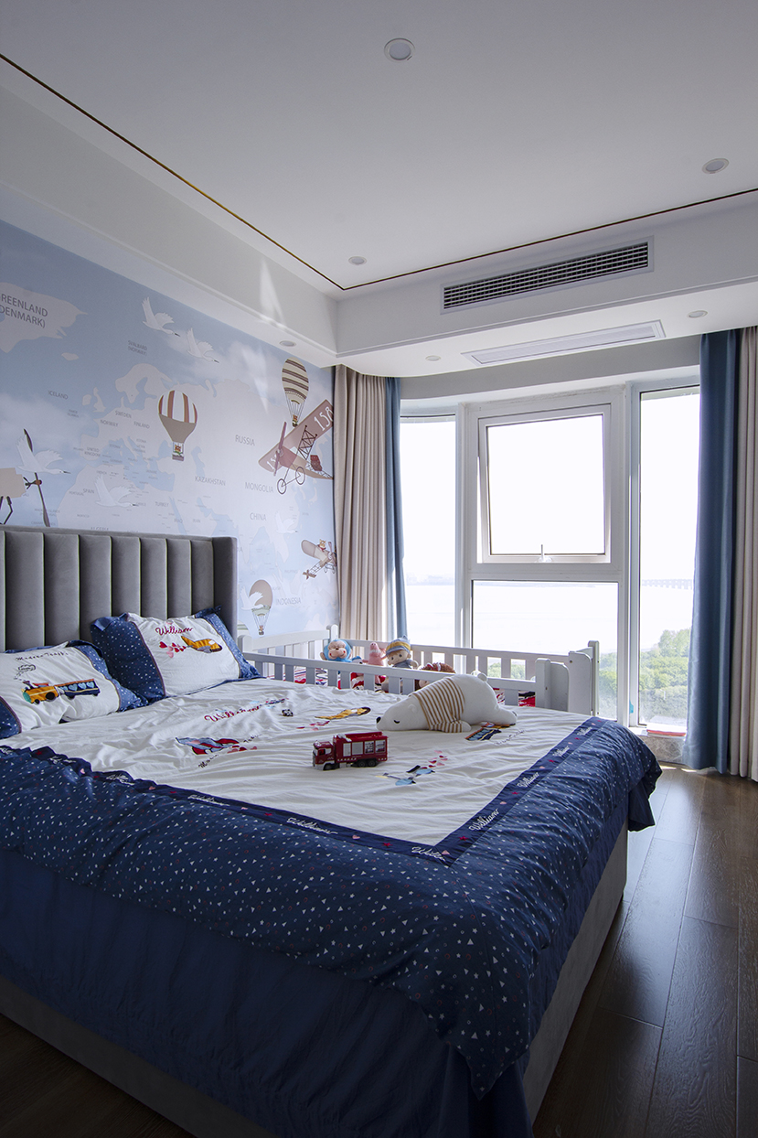 因?yàn)槭莻€(gè)BOY,所以小孩房的整體色系偏向藍(lán)色,背景墻專門定制了一張卡通畫。