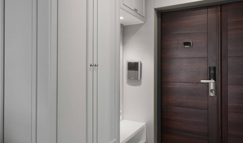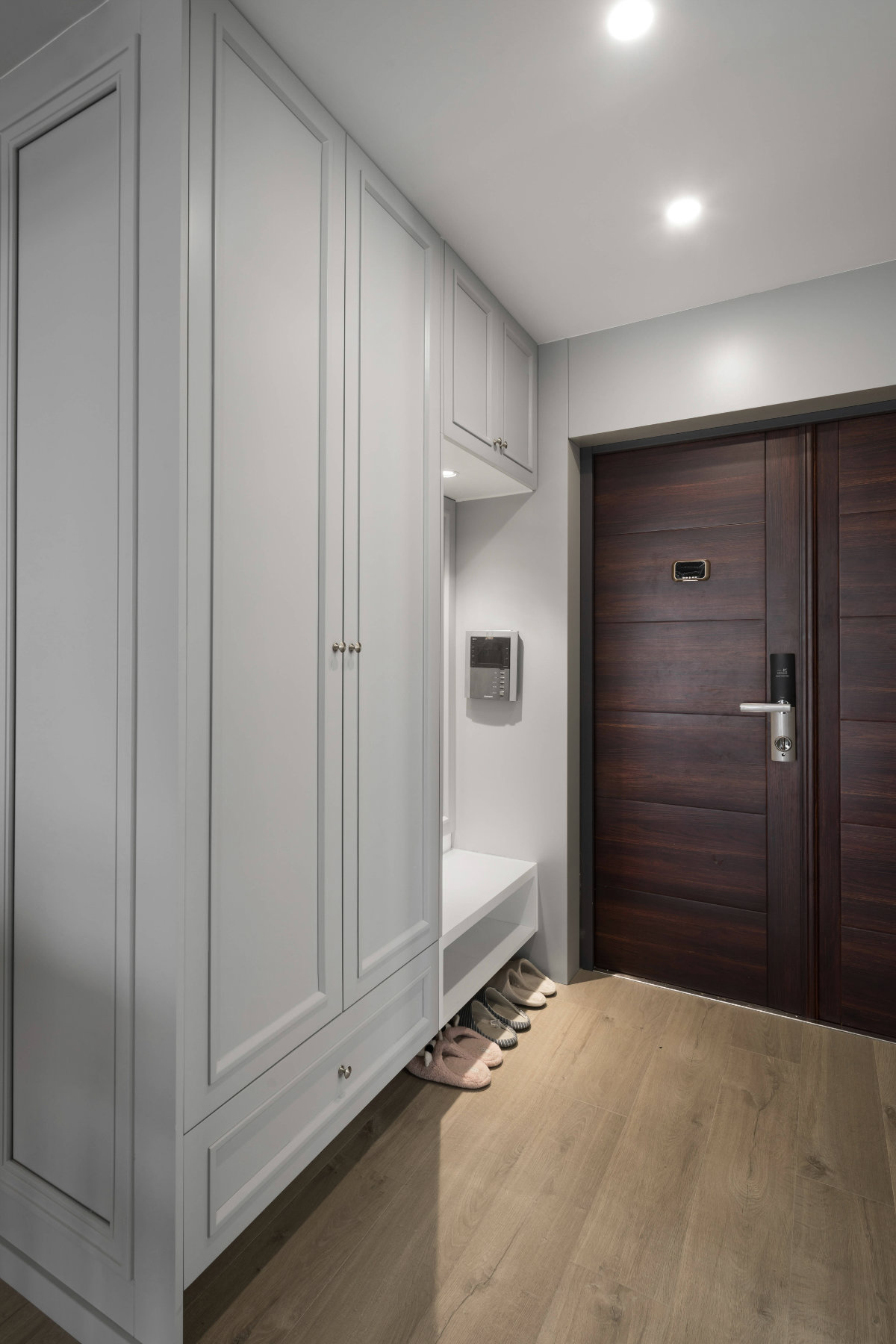 玄關(guān)柜中部留空嵌入光源,可作換鞋凳,底部懸空便于收納常用拖鞋。
