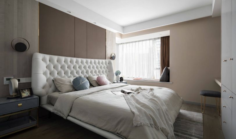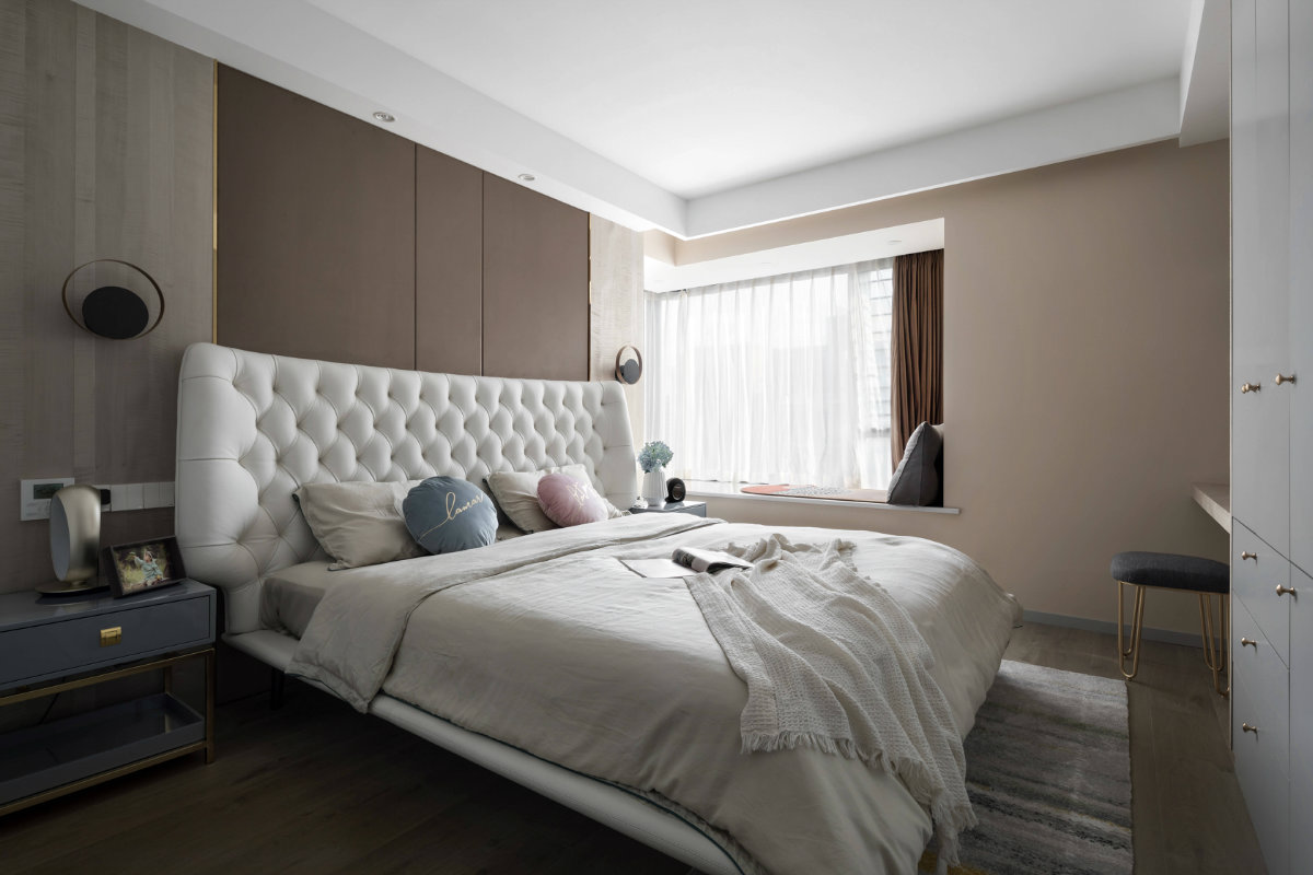 米白色的皮質(zhì)床靠在咖色的軟包床頭墻上,