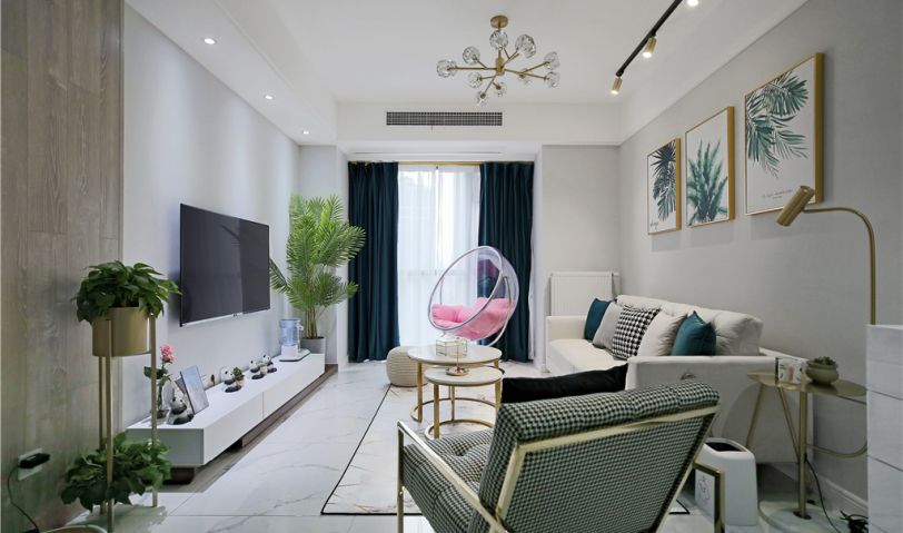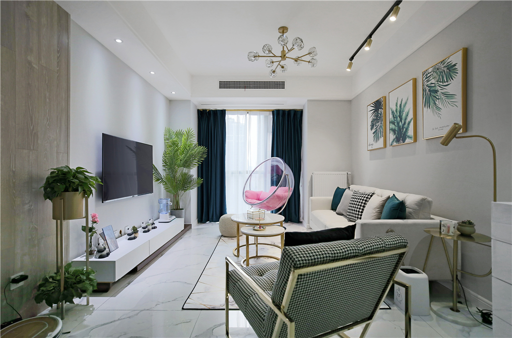 整體客廳空間以白色為主導(dǎo)色,配合胡桃木色墻板和地板,局部墻面點綴黑色,中和整個空間,為了使得空間相對活潑,軟裝的選擇上跳躍了一些,讓整體材質(zhì)與顏色相互呼應(yīng)。