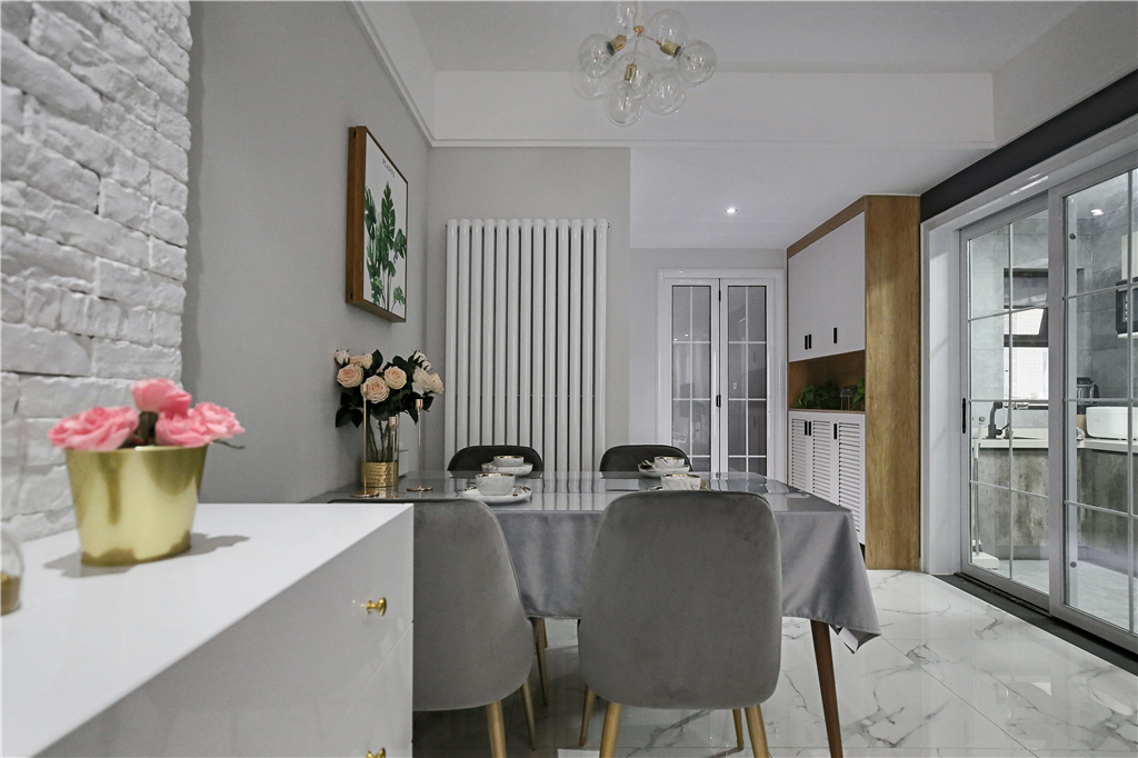 由于餐廳空間略顯狹小,暖氣片便成了墻面獨(dú)特的裝飾,金屬、絲絨等帶著輕奢符號的元素妝點餐廳,營造一種低調(diào)卻又有品質(zhì)的生活氣息。