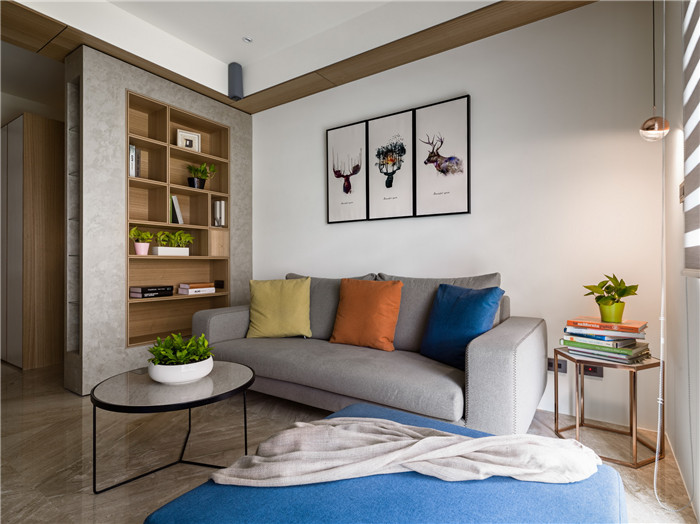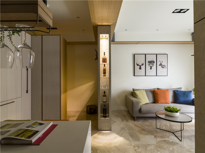 以玄關(guān)隔斷為基點(diǎn),入戶后隱形指引至客廳區(qū)、餐廚區(qū)、臥房區(qū)動(dòng)線。精致材質(zhì)與工藝、低調(diào)卻講究的背景,讓整個(gè)空間暖感視野得以優(yōu)雅呈現(xiàn)??紤]到坪數(shù)局限,讓墻面、柜體盡可能不占去太多空間,于是舍棄厚重的石材、木皮等建材,采以獨(dú)特的 Spiver 意大利頂級(jí)特殊涂料、鋪敘玄關(guān)與電視墻,不但網(wǎng)羅大器感,也同時(shí)輕簡(jiǎn)化立面與量體;地板則采以蒂諾大理石鋪展,營(yíng)造公領(lǐng)域的精致感,在高雅的背景之中,適度妝點(diǎn)粉橘、蒼綠、寶藍(lán)等馬卡龍色彩抱枕,營(yíng)造出暖調(diào)而高雅的北歐氣息。電視墻Spiver 意大利頂級(jí)特殊涂料延伸至次臥隔墻,讓主題量體呈現(xiàn)。大地色系搭配粉橘、蒼綠、寶藍(lán),在沉穩(wěn)中多了粉色繽紛。地板鋪設(shè)明亮帝諾大理石,鏡射效
