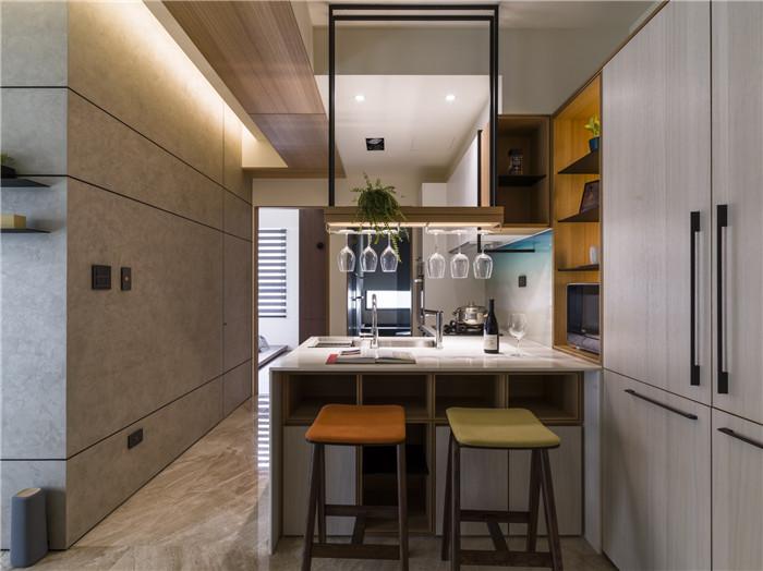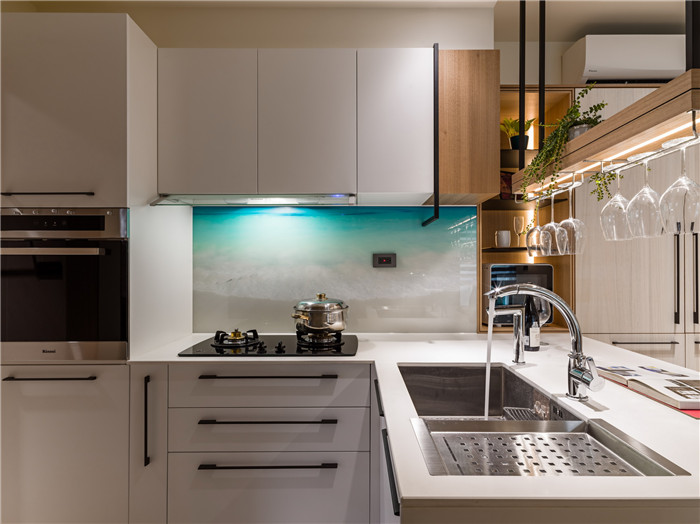 餐廚區(qū)每一項(xiàng)柜體尺寸到收納形式,都經(jīng)過(guò)縝密規(guī)劃,在料理臺(tái)墻面加入彩印玻璃,印出藍(lán)色海灘的意象,讓沒(méi)有窗戶的廚房、也能納入浪漫的海景畫面。餐廚領(lǐng)域依照一家人需求量身訂制,考慮到人口簡(jiǎn)單,于是以吧臺(tái)取代餐桌。