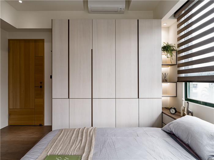 讓兩間臥房都顯得較小,於是在主臥內(nèi),選擇架高地坪、以貼地的床具形式保留開放感。窗面採(cǎi)光的明亮進(jìn)駐,使房?jī)?nèi)絲毫不覺(jué)封閉、反倒顯得具有呼吸感,簡(jiǎn)約中更注重細(xì)節(jié),得以彰顯品味??桃獠皇┳鞯巾?shù)牧矿w,收納功能更人性化也避免過(guò)重壓迫感,玫瑰金床頭吊燈,為主臥室增色許多。衣柜門片延續(xù)全空間精細(xì)的現(xiàn)場(chǎng)作工貼皮,也舍棄五金拉手由木工藝暗拉手取代,兼顧了功能與線條構(gòu)圖,全現(xiàn)場(chǎng)打造木工藝一體成形的複合式床架,把單層空間作出雙層有效利用,藉著機(jī)能的向上延伸,以及無(wú)所不在的收納機(jī)能,徹底激發(fā)小空間的坪效。