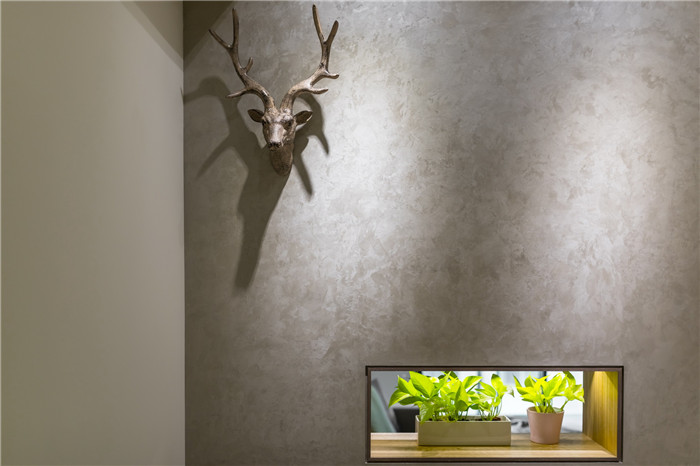 墻面佐以絲絨感意大利藝術(shù)涂料,再加入趣味的鹿頭裝飾,營(yíng)造出暖調(diào)而高雅的北歐氣息。
