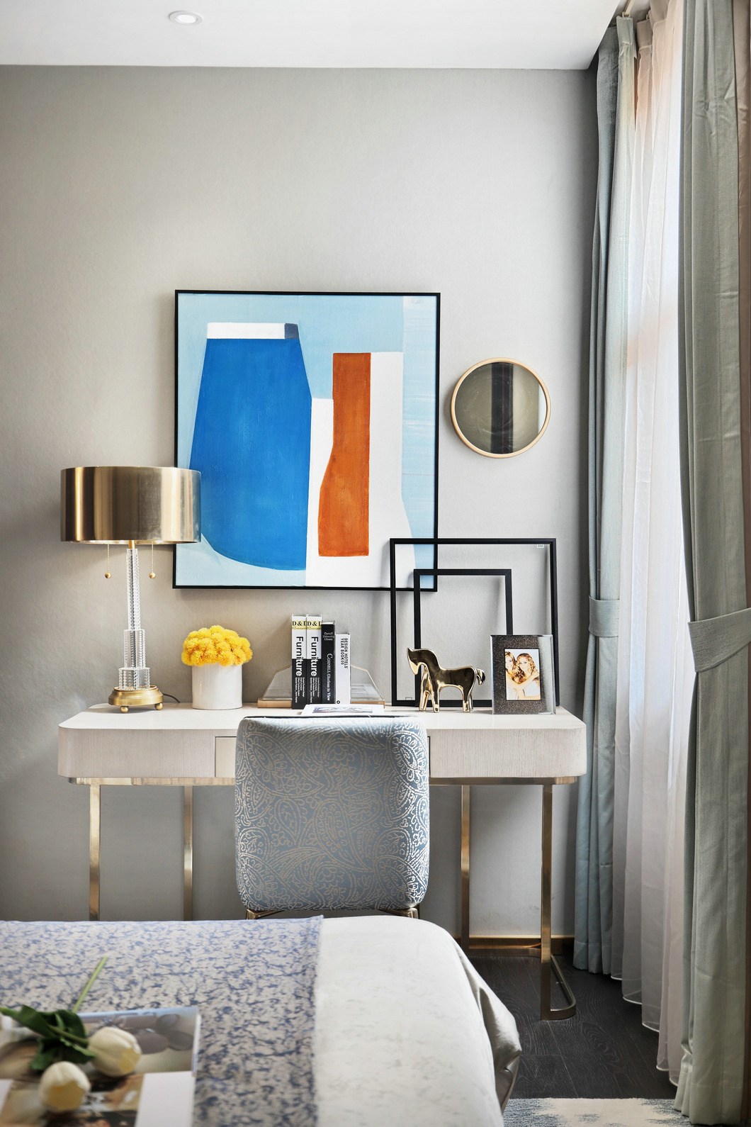 臥室以森系色調(diào)為主,自然清新,營(yíng)造出更加放松而舒適的休息環(huán)境。淺色系的床頭背景墻與深色的床品形成色彩的對(duì)比,一明一暗,一深一淺,鮮明的差異化表達(dá)讓視覺(jué)層次更加豐富。造型簡(jiǎn)約的金屬臺(tái)燈,典雅細(xì)的線條透露出精巧的美感,金屬的光澤為臥室空間增添了幾分靈動(dòng),搭配極具金屬線條感的床頭桌,讓每一次的使用都恰好符合手臂伸展的舒適角度,從細(xì)節(jié)出發(fā)打造美好生活。