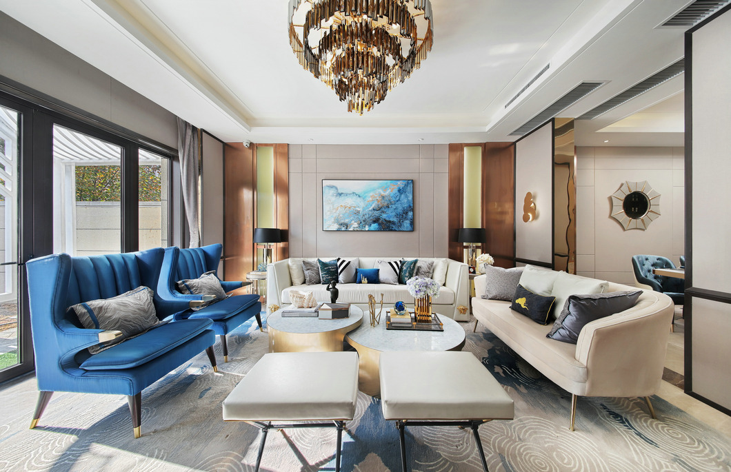客廳以白色與香檳色為基礎(chǔ)色調(diào),讓客廳風(fēng)格顯得干凈明快,靈動(dòng)的金屬光澤巧妙地塑造了客廳的空間感,讓客廳的視覺(jué)空間得到了極好的延伸和拓展。明亮的主色調(diào)搭配鮮艷藍(lán)色的點(diǎn)綴,讓客廳在充足的光線下煥發(fā)出充沛的朝氣與活力,令人感到溫暖而舒暢。